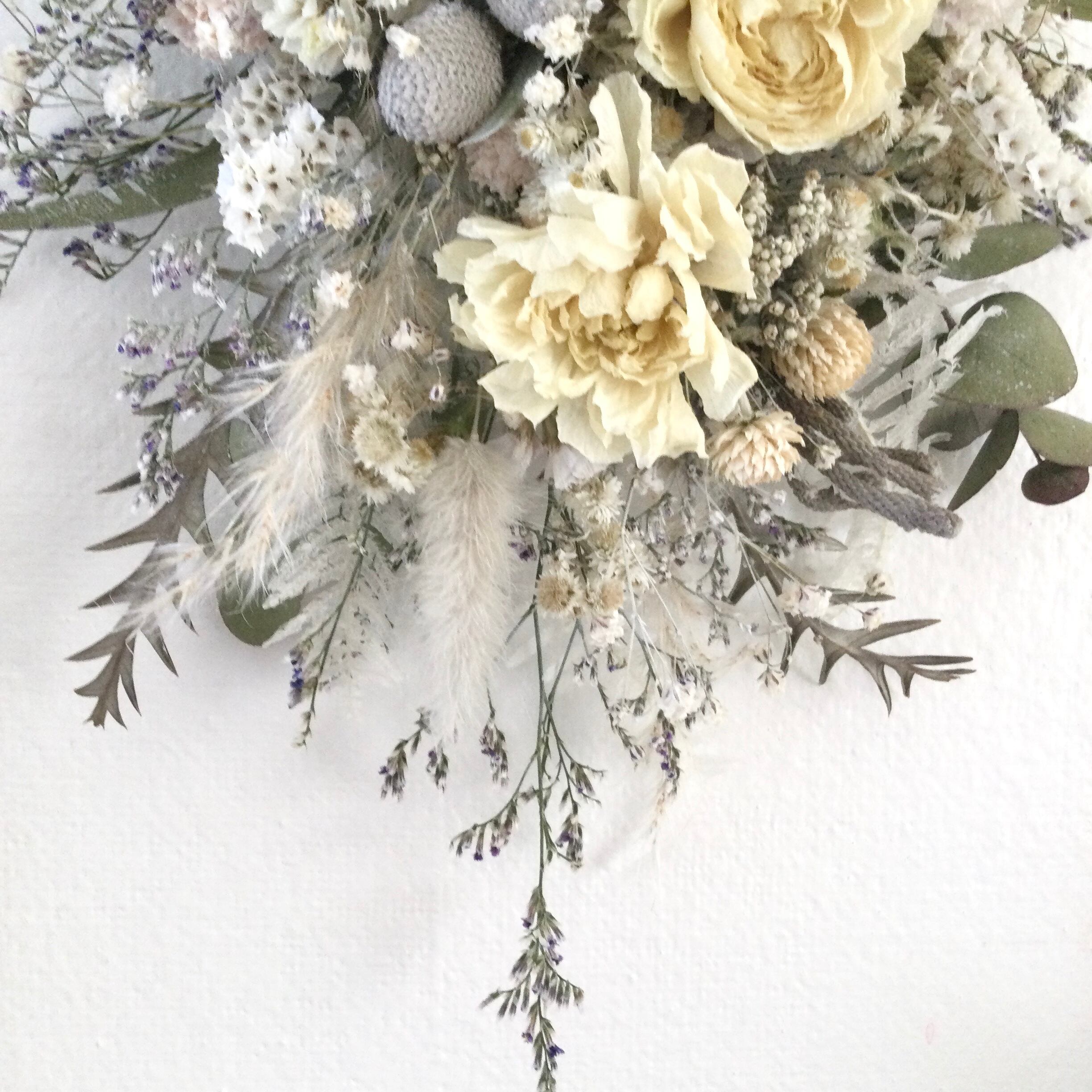 ホワイトのラナンキュラス スターチス 千日紅 とふわふわススキ パンパスグラスなど小花たっぷりにふんわりまとめました。