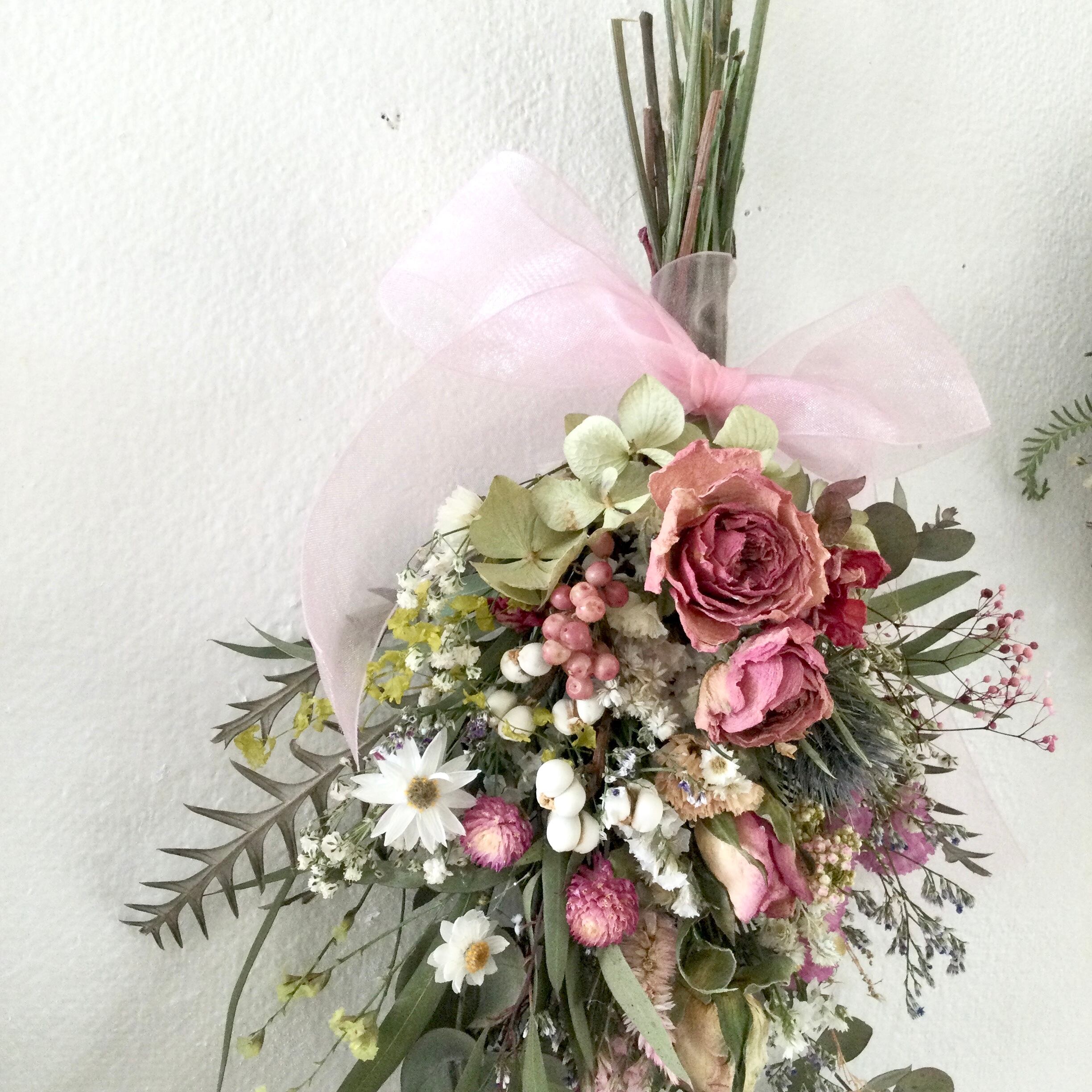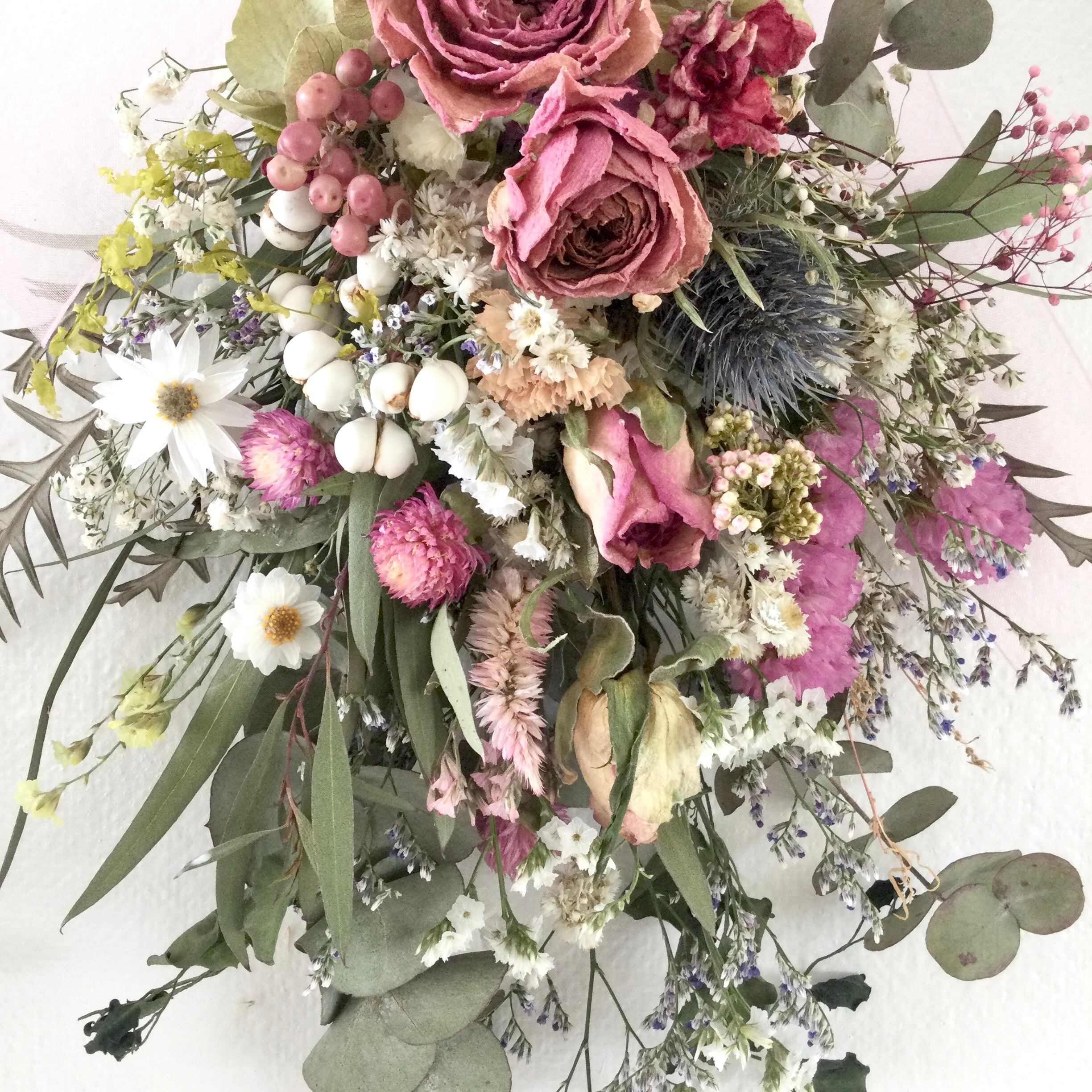 ・花材 ユーカリ ローズ エリンジューム スターチス HBスターチス かすみ草 ブルーファンタジア 紫陽花 シダ ハハコソウ 花かんざし ナンキンハゼ アイバンホー 千日紅 ケイトウ ペッパーベリー リボン等