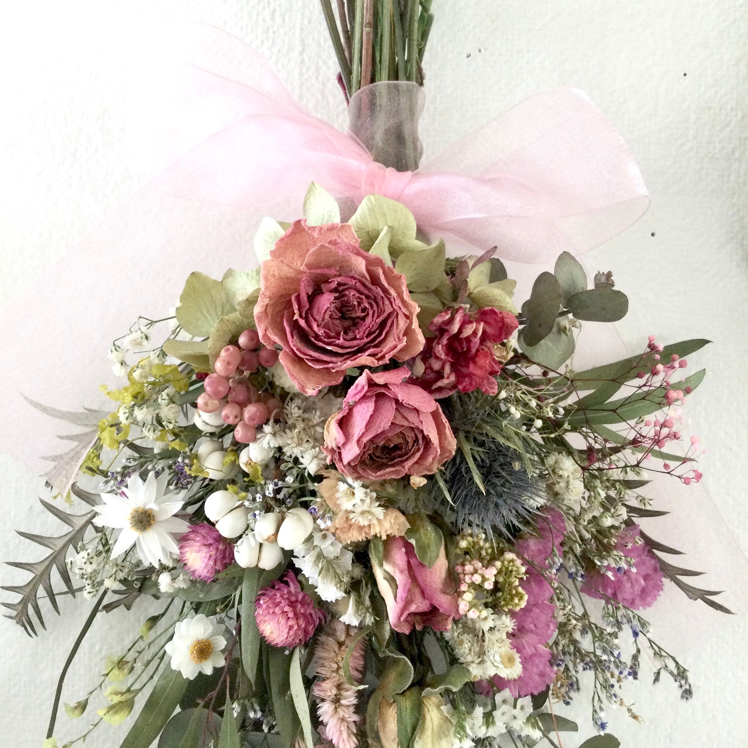 ローズとユーカリ エリンジューム スターチス 花かんざしなど可愛いお花をふんわりまとめました。