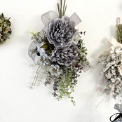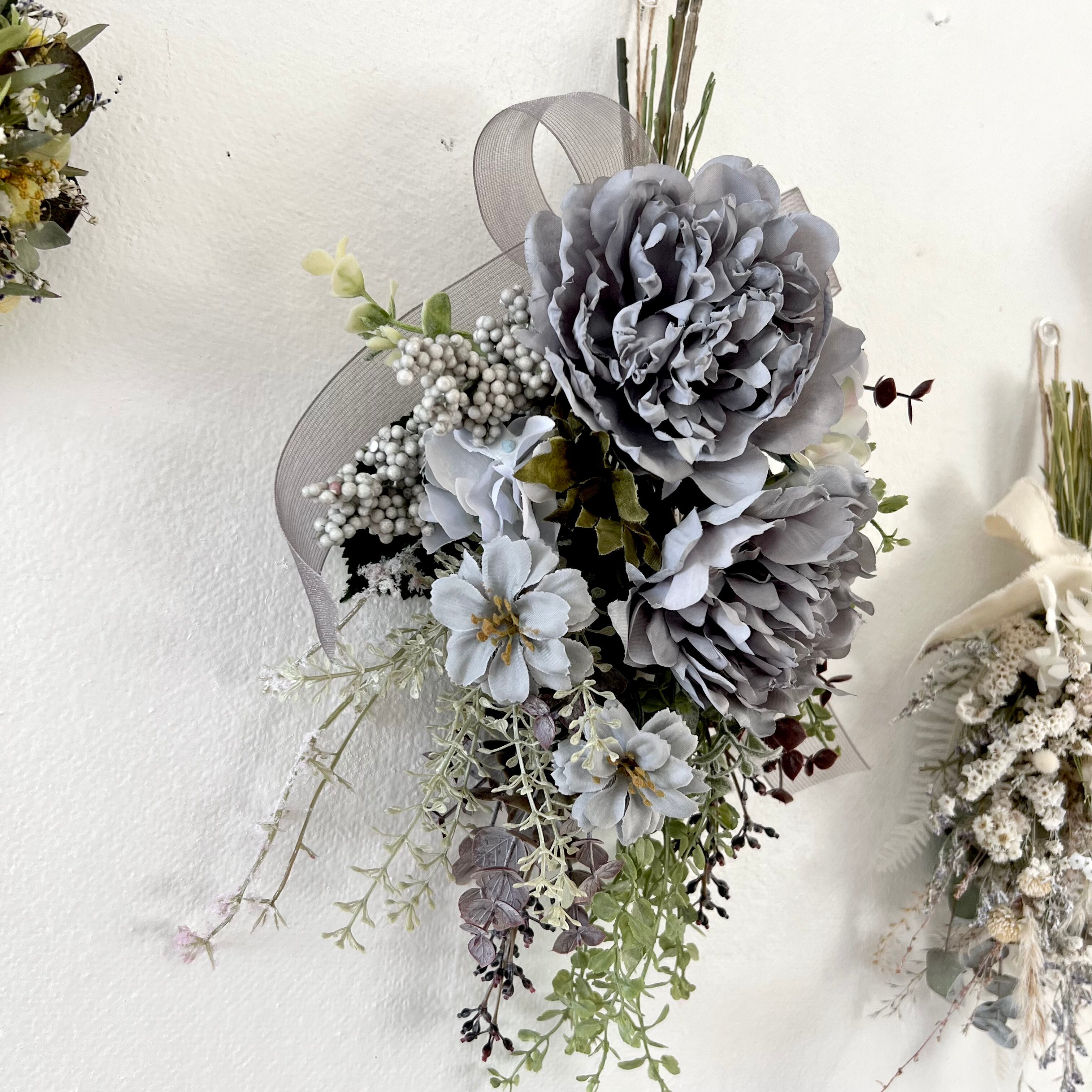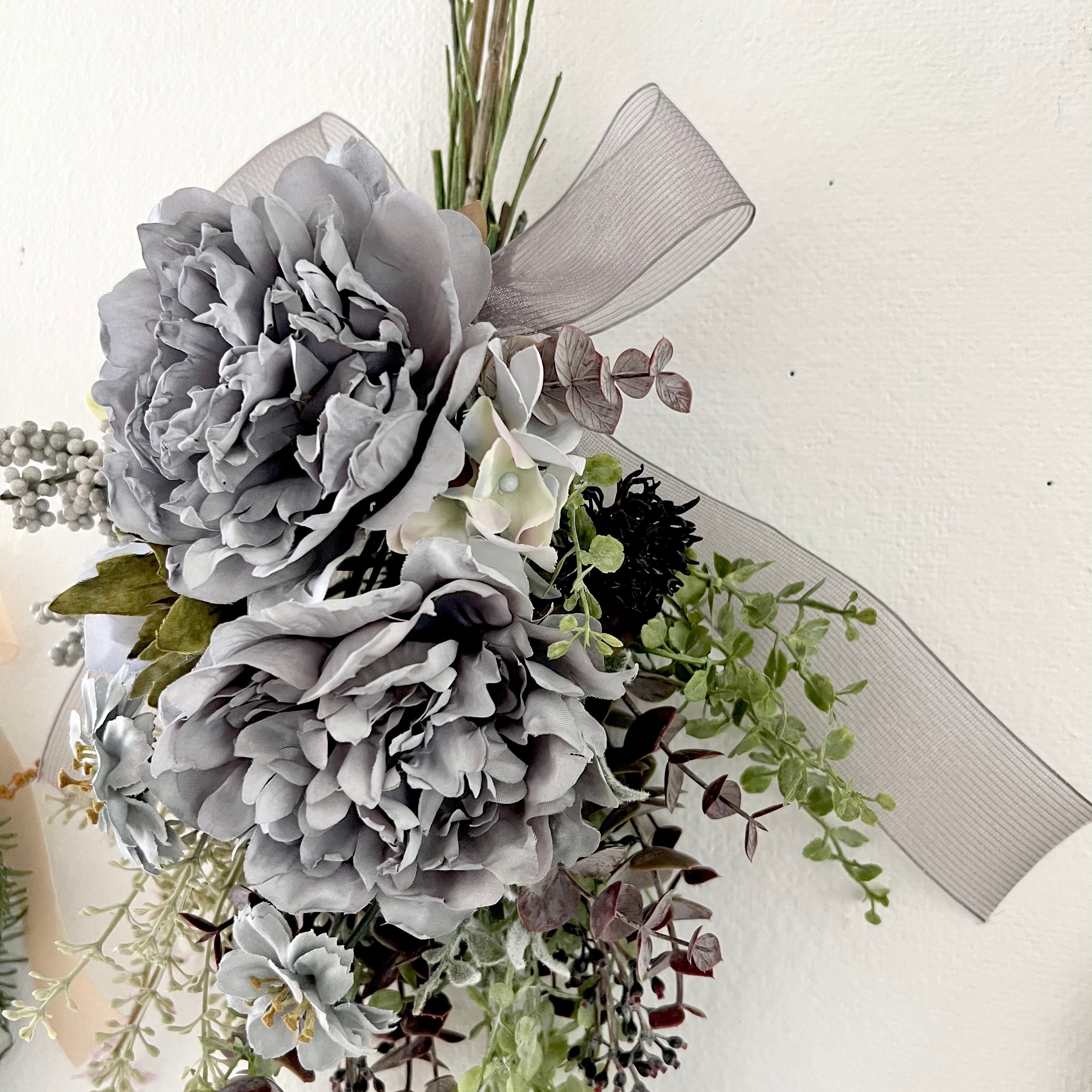 グレーのピオニー ジニア ユーカリ ライスフラワーグリーンを合わせたスワッグです。