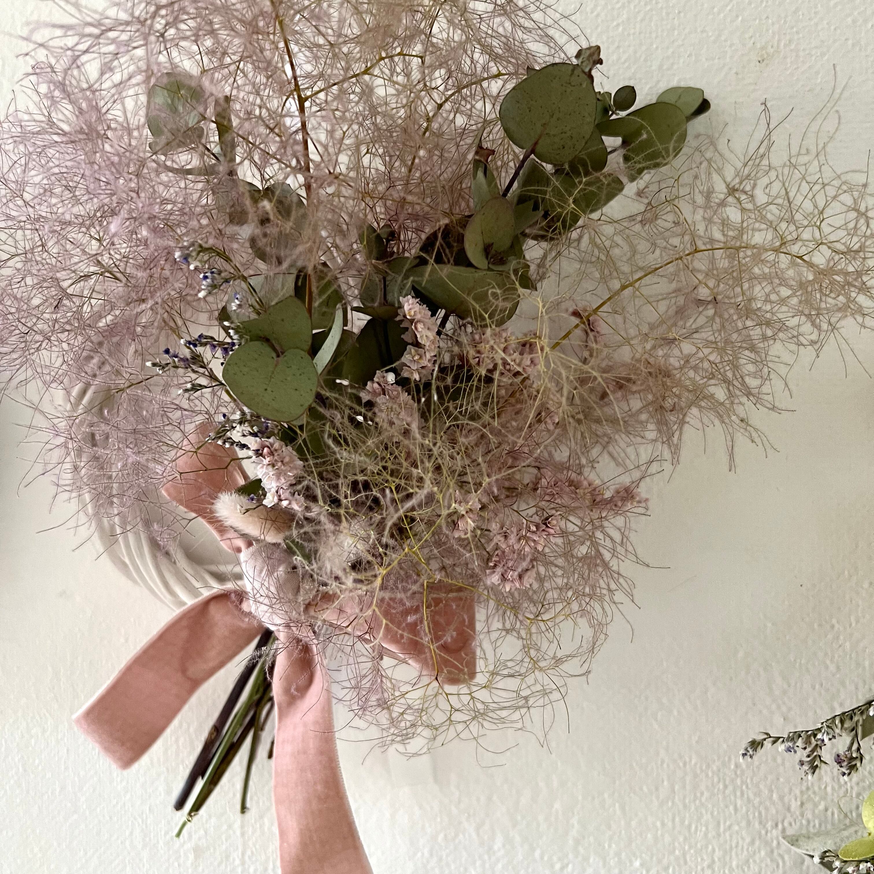 ふわふわスモークツリーと優しいお色のベルベットリボンが可愛いです。
