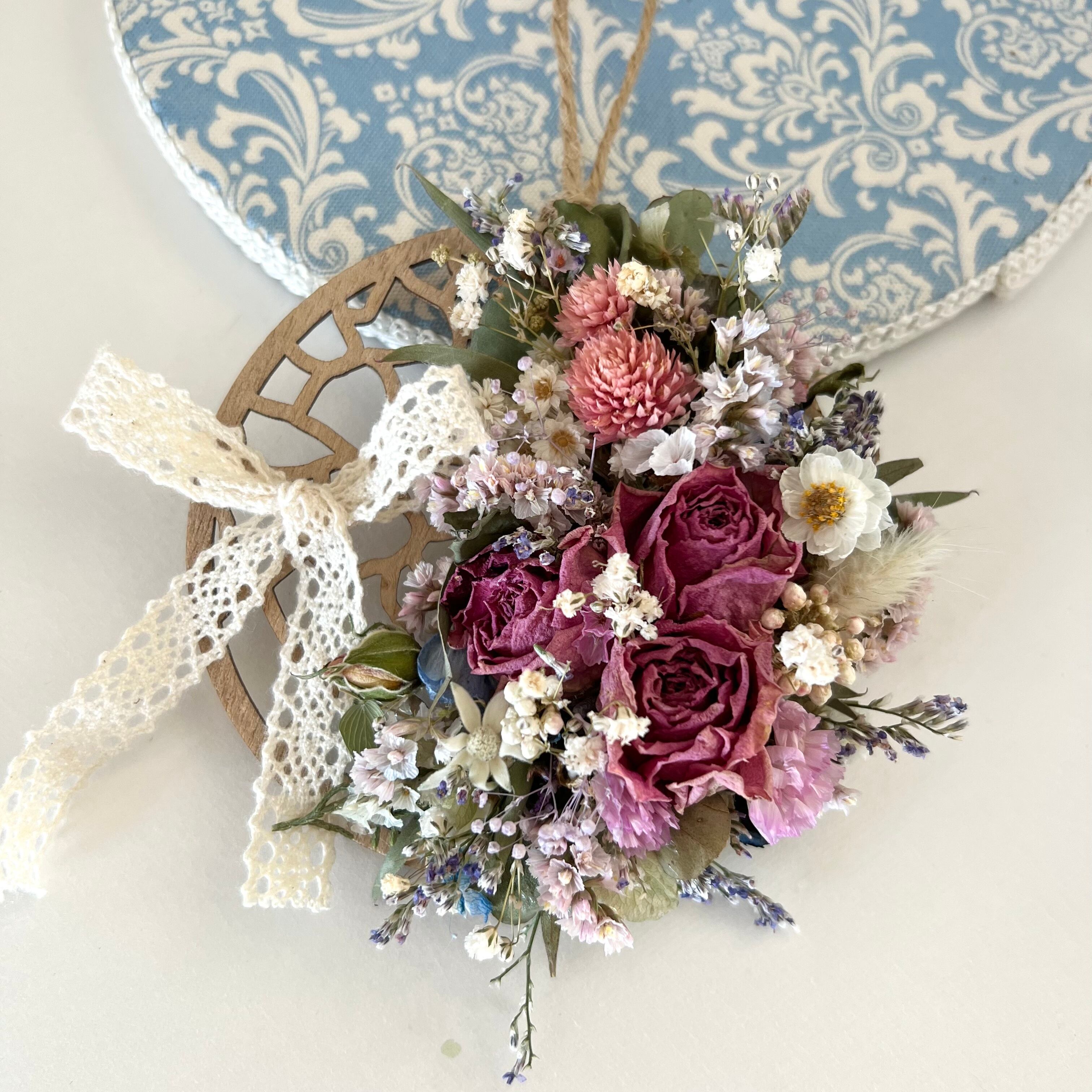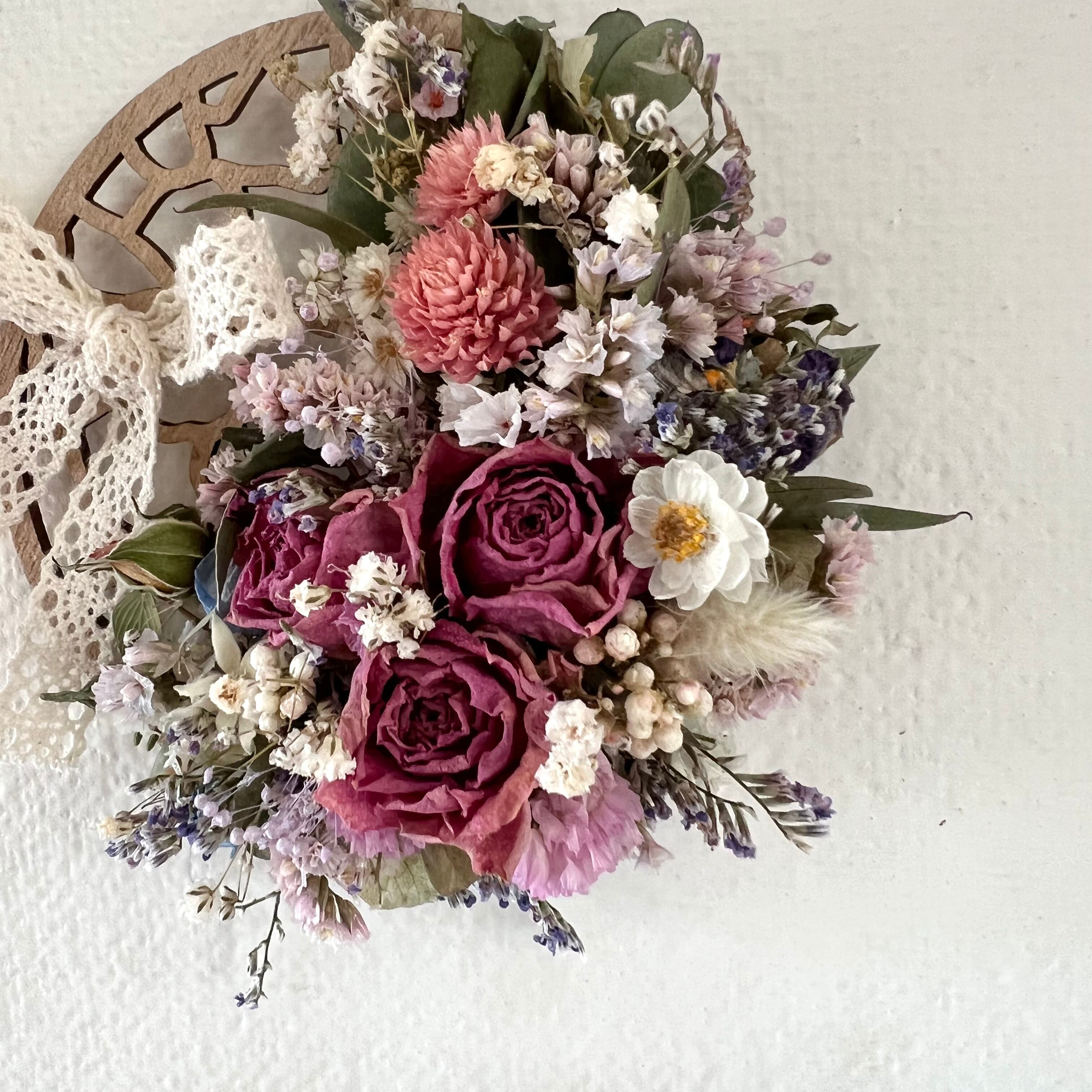ピンクローズと小花のオーナメント 壁飾り ドライフラワー 誕生日プレゼント 引っ越し祝い 記念日 ギフト