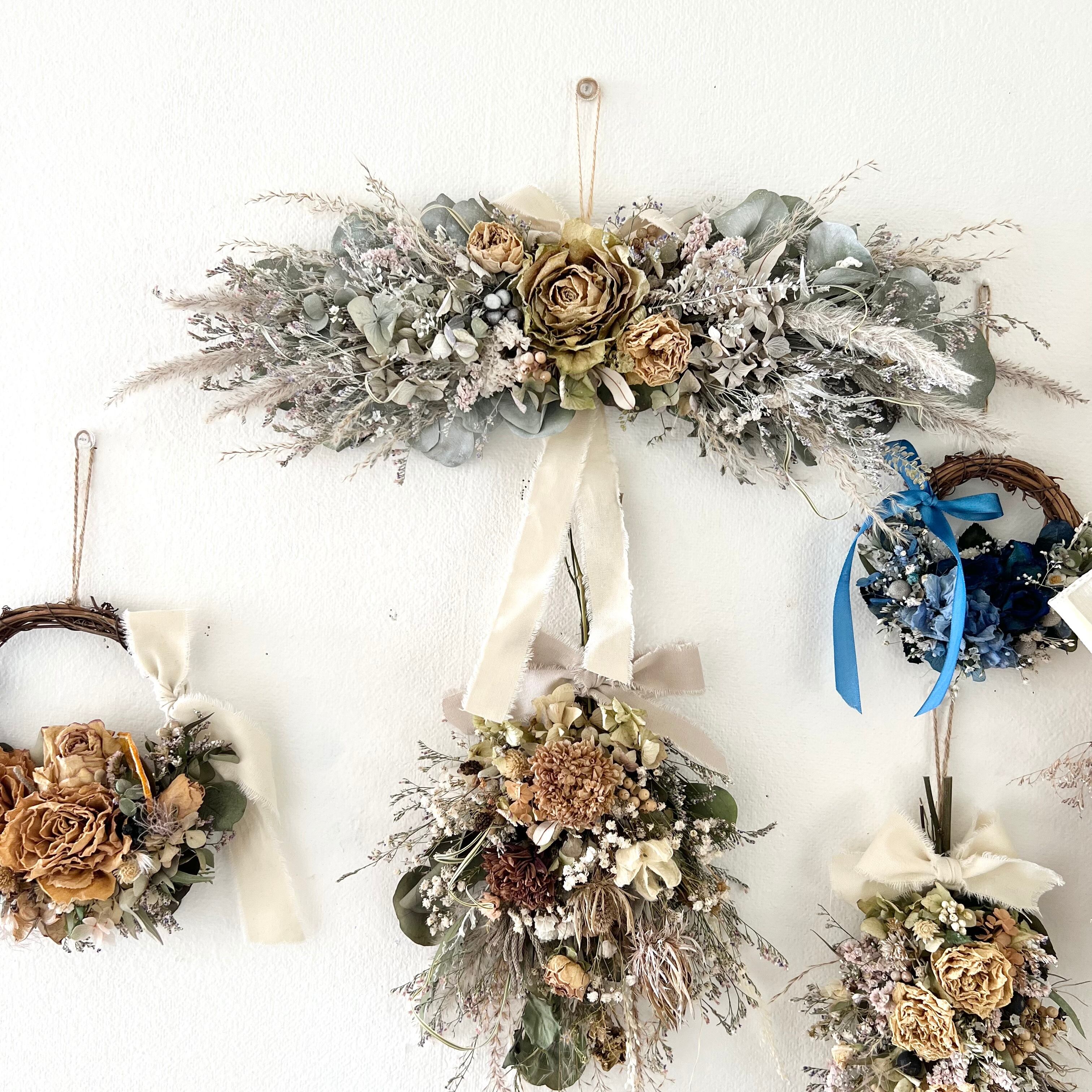 ・花材 ドライフラワー ローズ ユーカリ スターチス かすみ草 ブルーファンタジア ダスティミラー ハハコソウ リーフ チガヤ リングラスナズナ ススキ ペッパーベリー シャリンパイ シダ リボン等