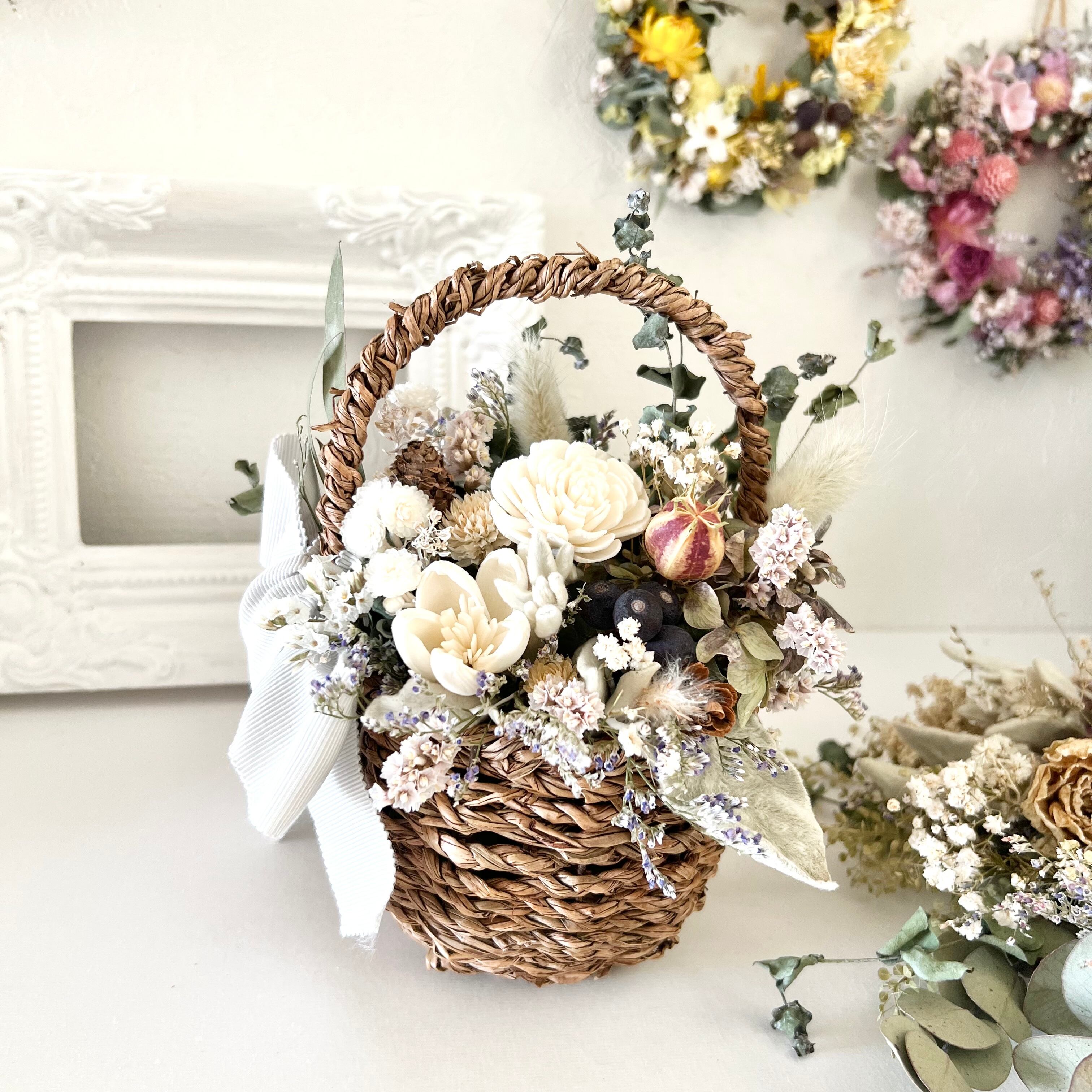 ・花材 ソラローズ ソラブロッサム イモーテル スターチス ブルーファンタジア かすみ草 ユーカリ 紫陽花 ラグラス ニゲラ 千日紅 シャリンパイ 木の実 ラムズイヤー バスケット リボン