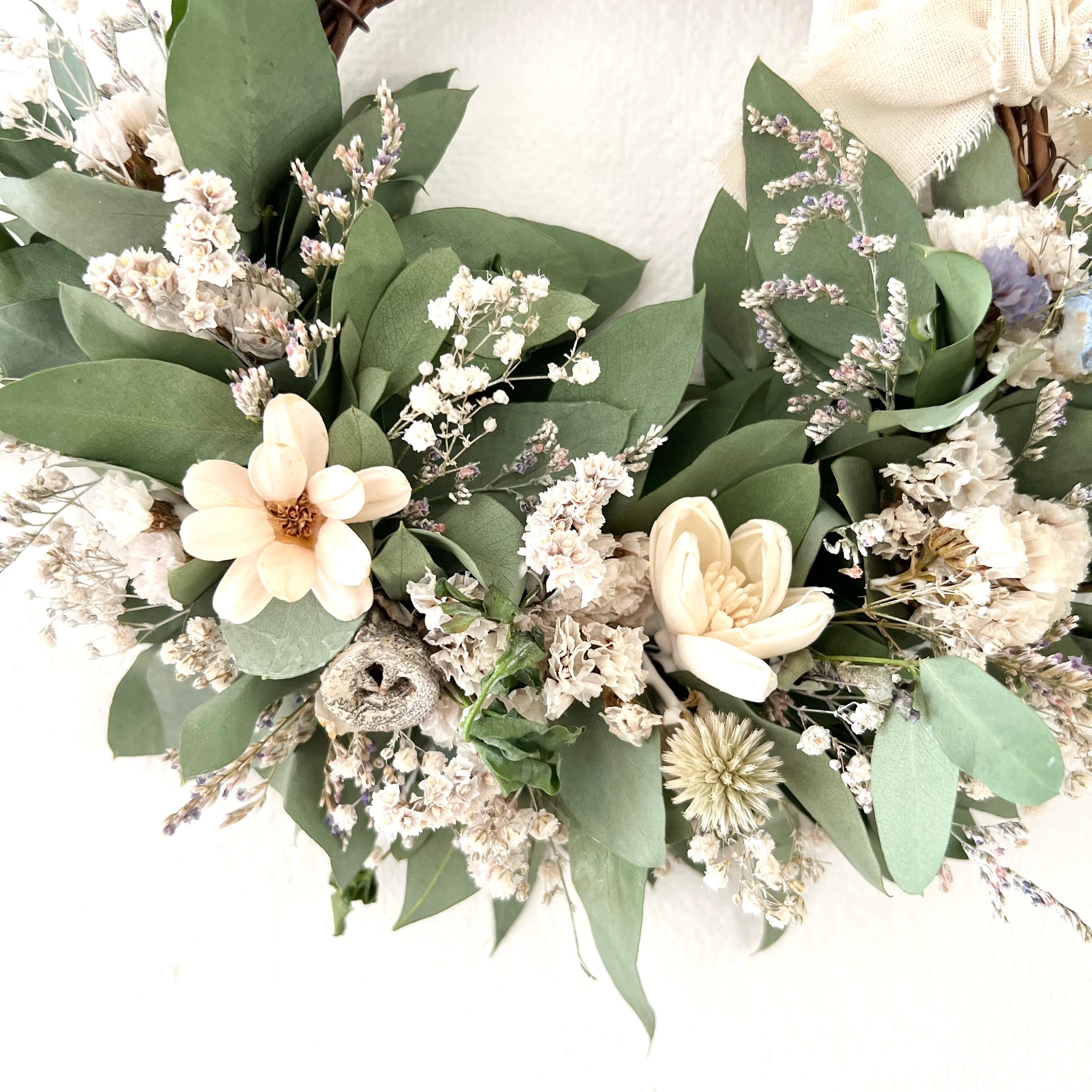 ユーカリとソラブロッサム プチフラワー 小花のリースです。