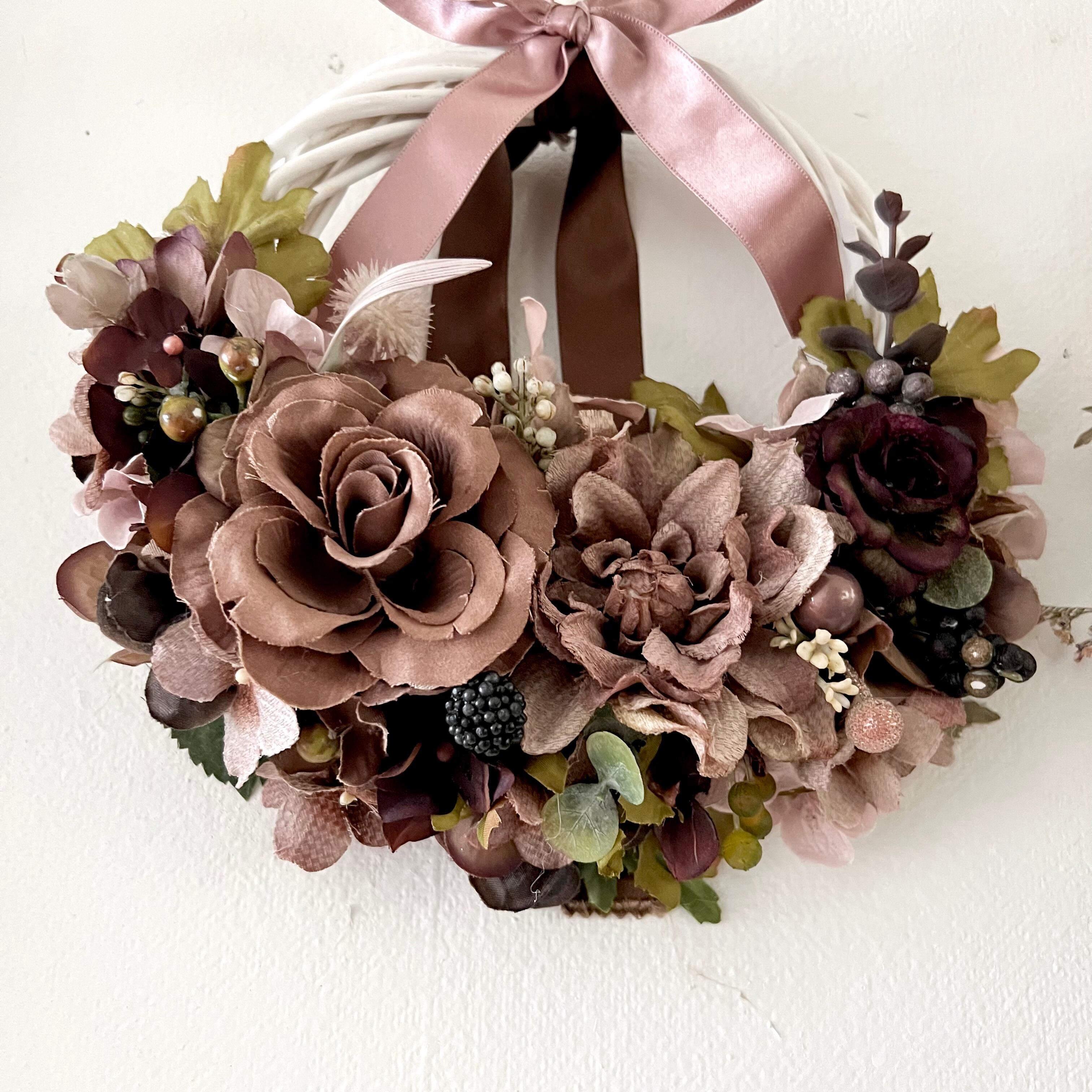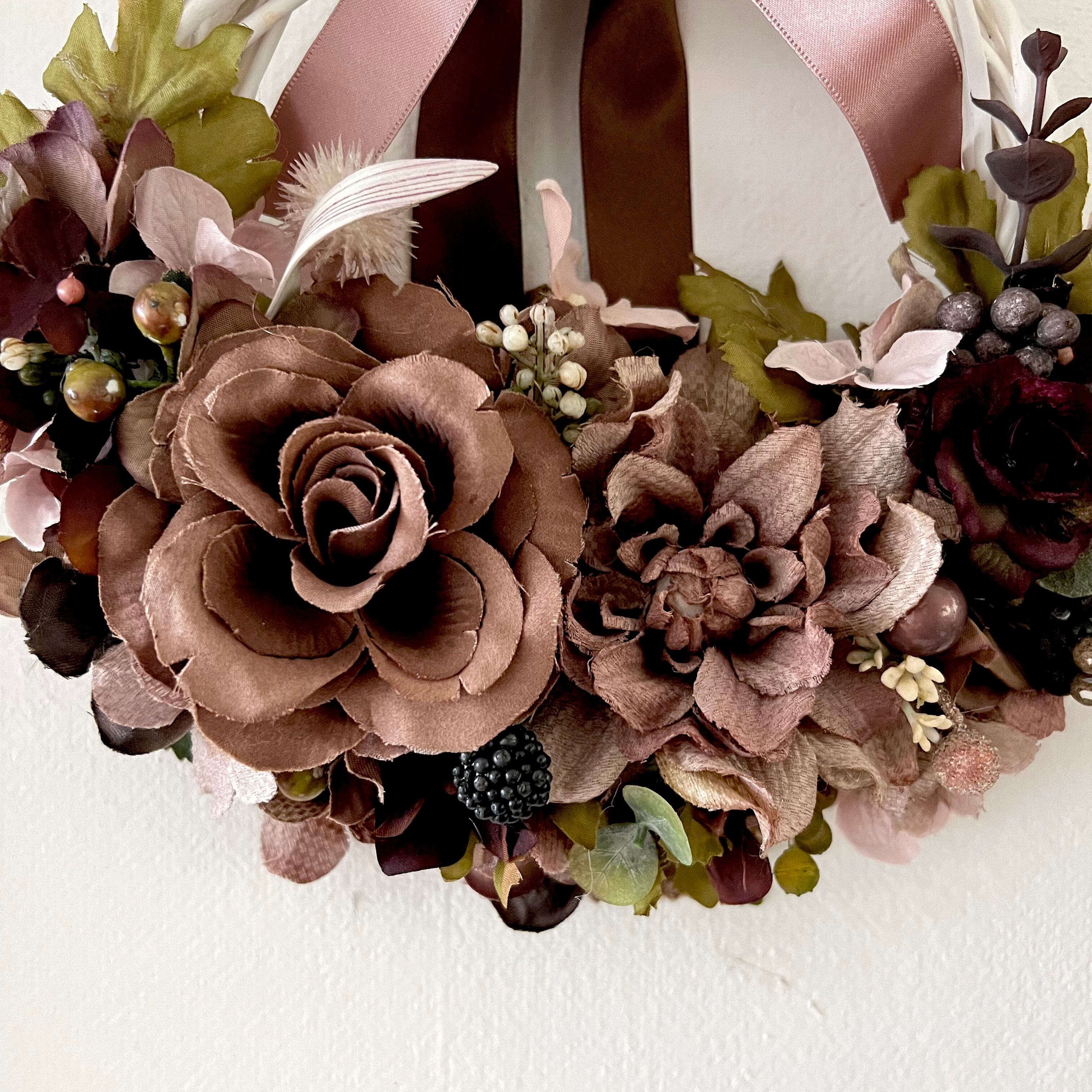 ブラウンのローズ ミニローズ ダリアと紫陽花などをまとめた可愛いリースです。