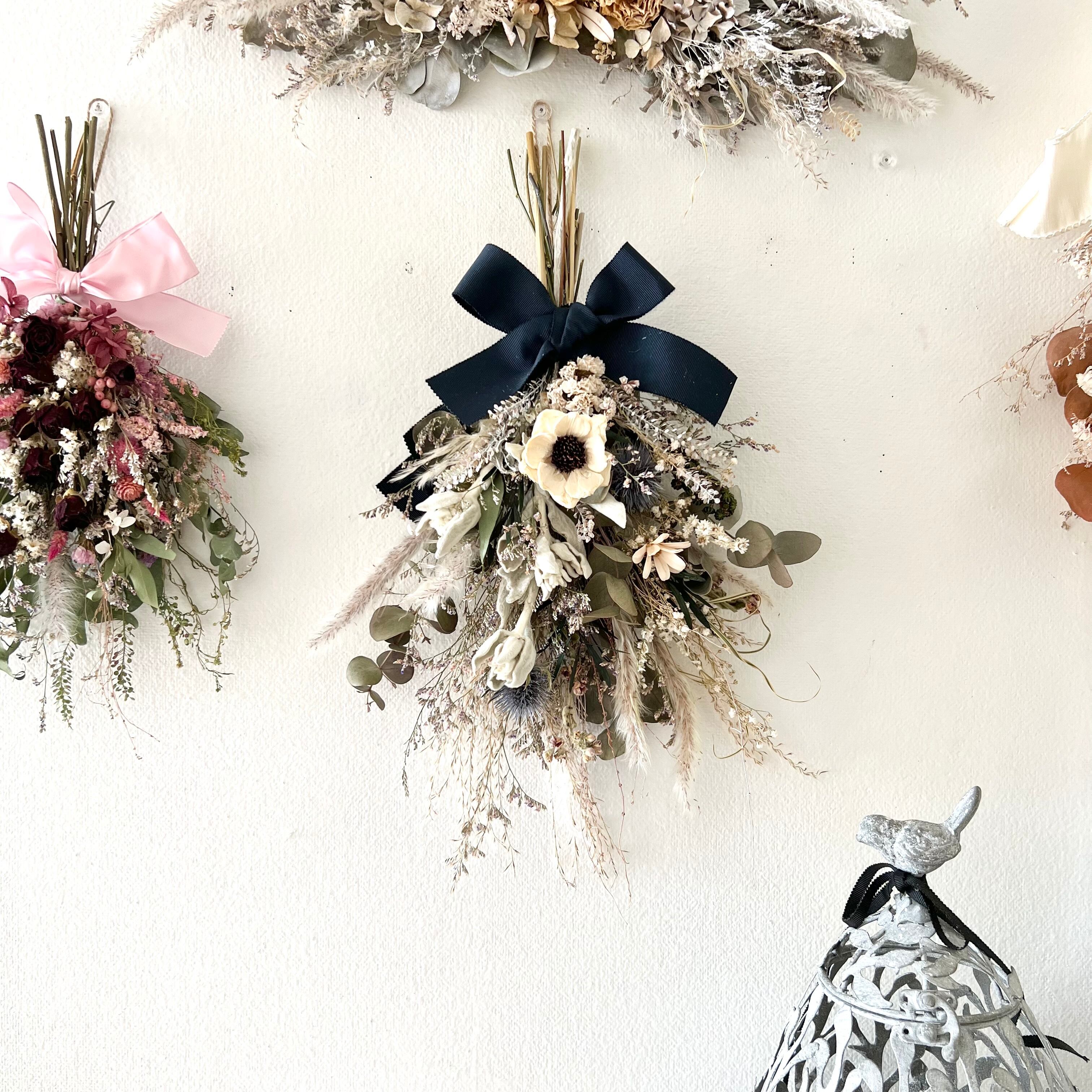ナチュラルカラーのソラアネモネ プチフラワーラムズイヤー エリンジュームと小花を合わせたスワッグです。