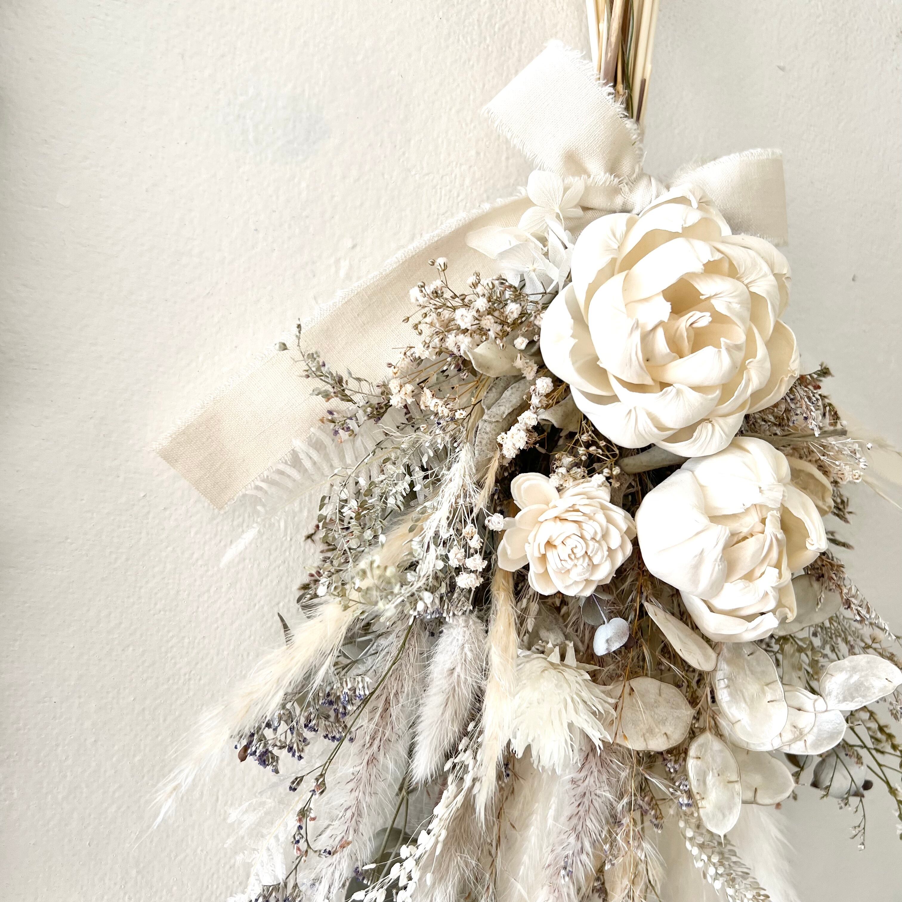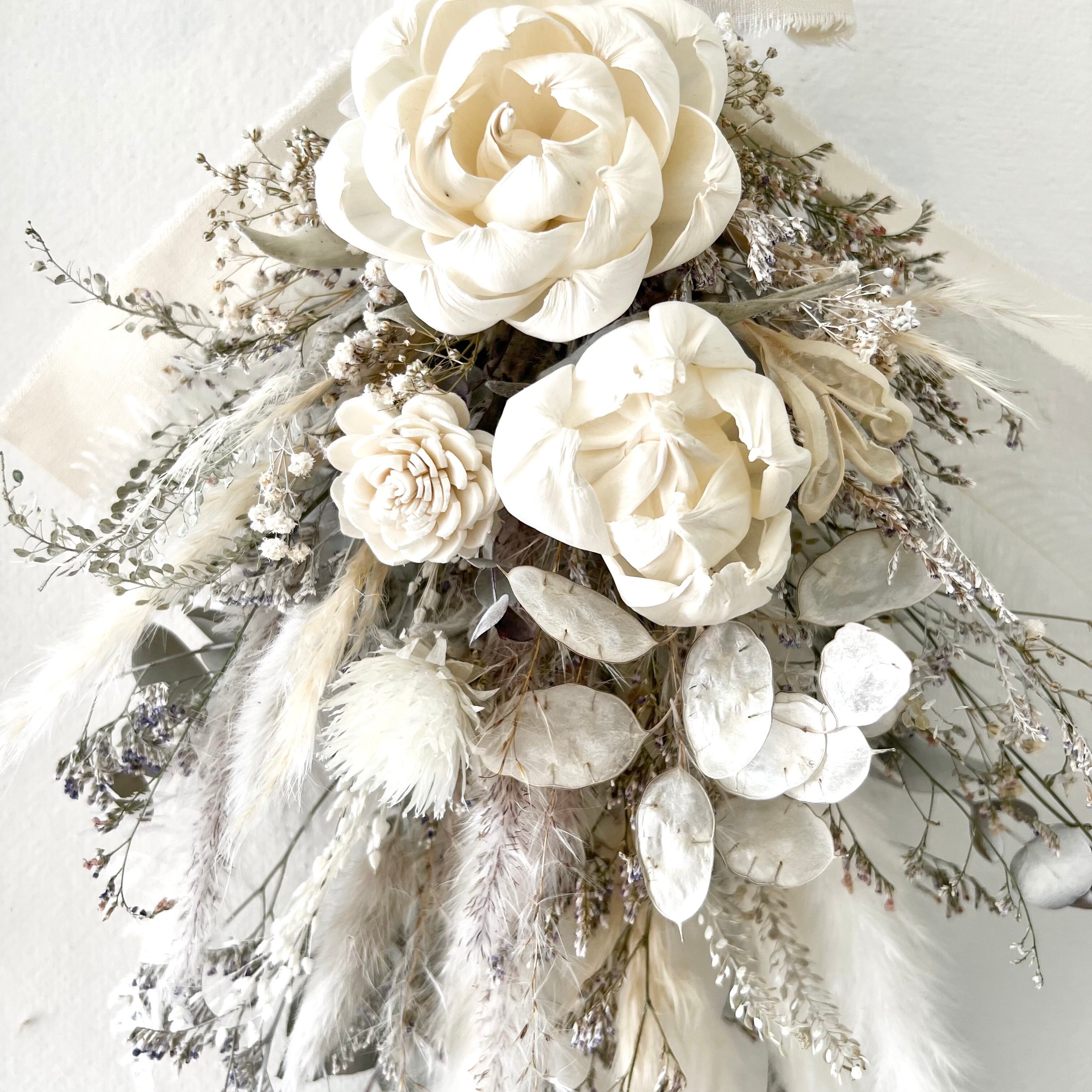 ナチュラルホワイトのソラピオニー ソラローズ シルバーデージー とテールリード パンパスグラス ルナリア ユーカリ ラグラス リーフ 小花を合わせたちょっとシャビーなスワッグです。