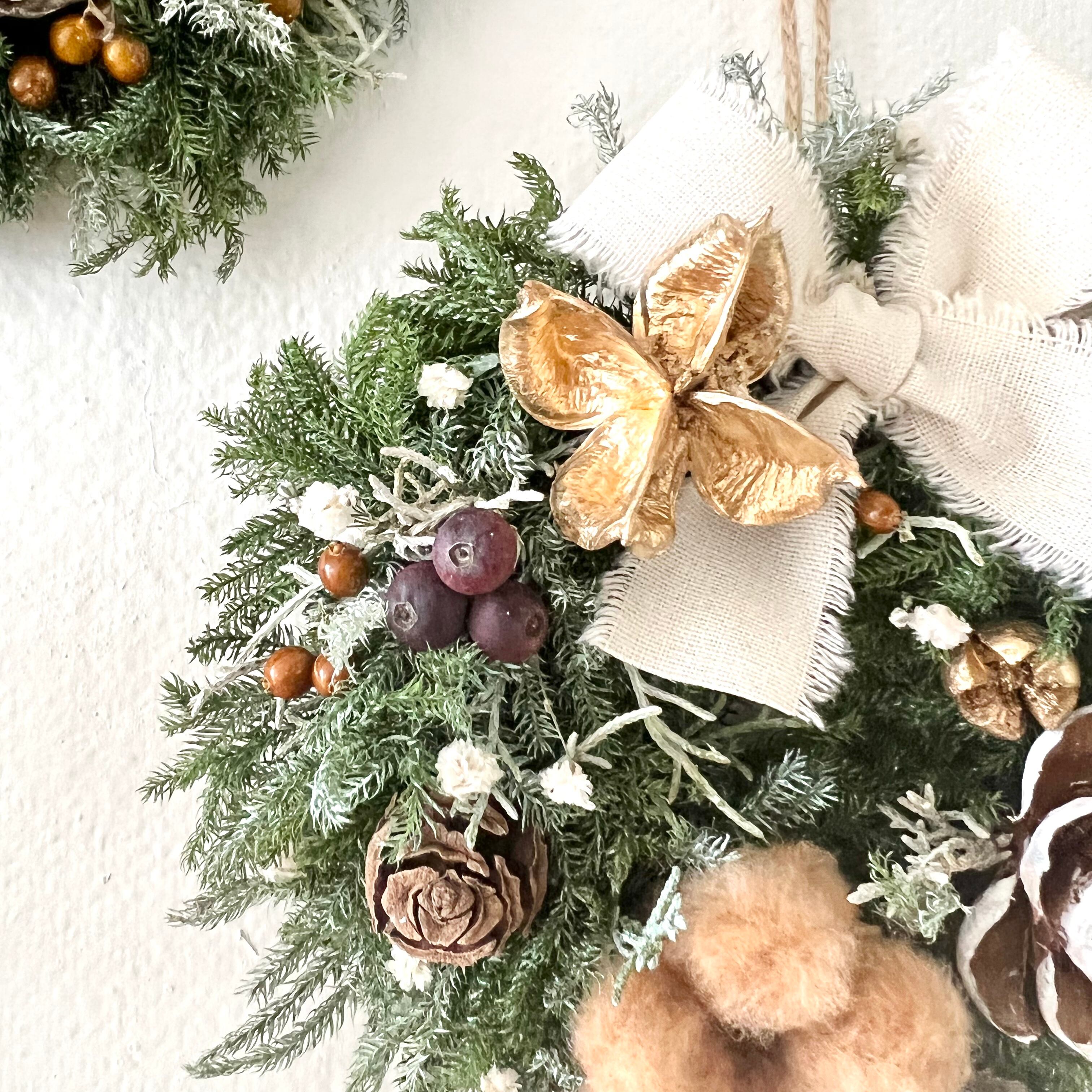コットンフラワーとシダローズ グリーンのクリスマスリース