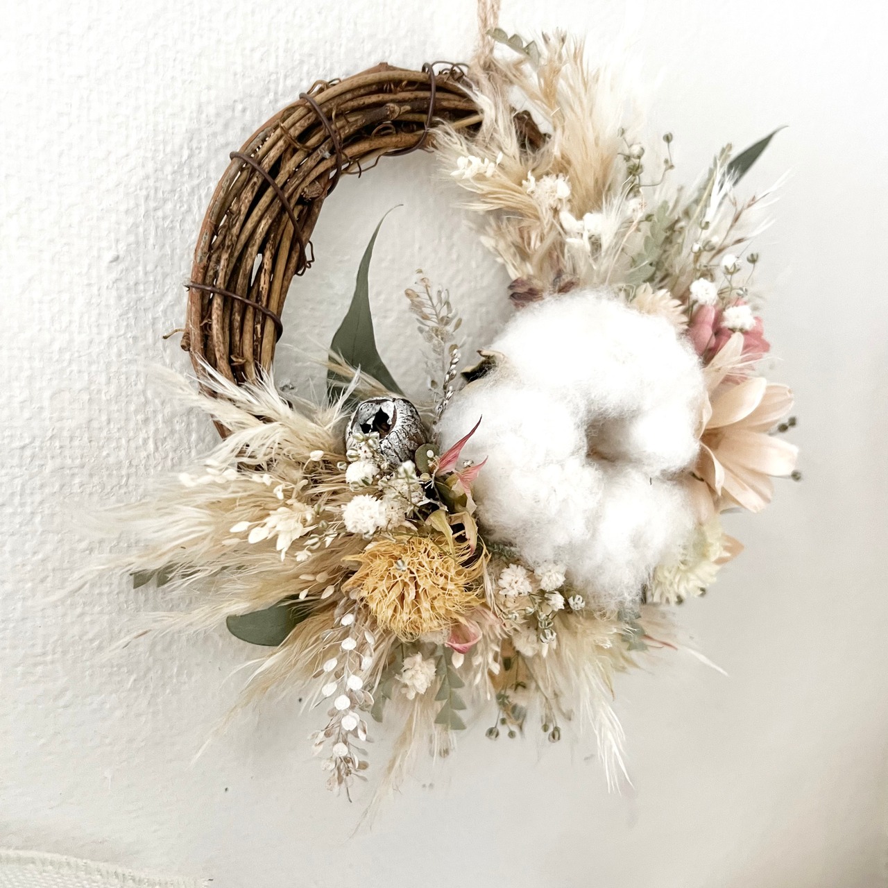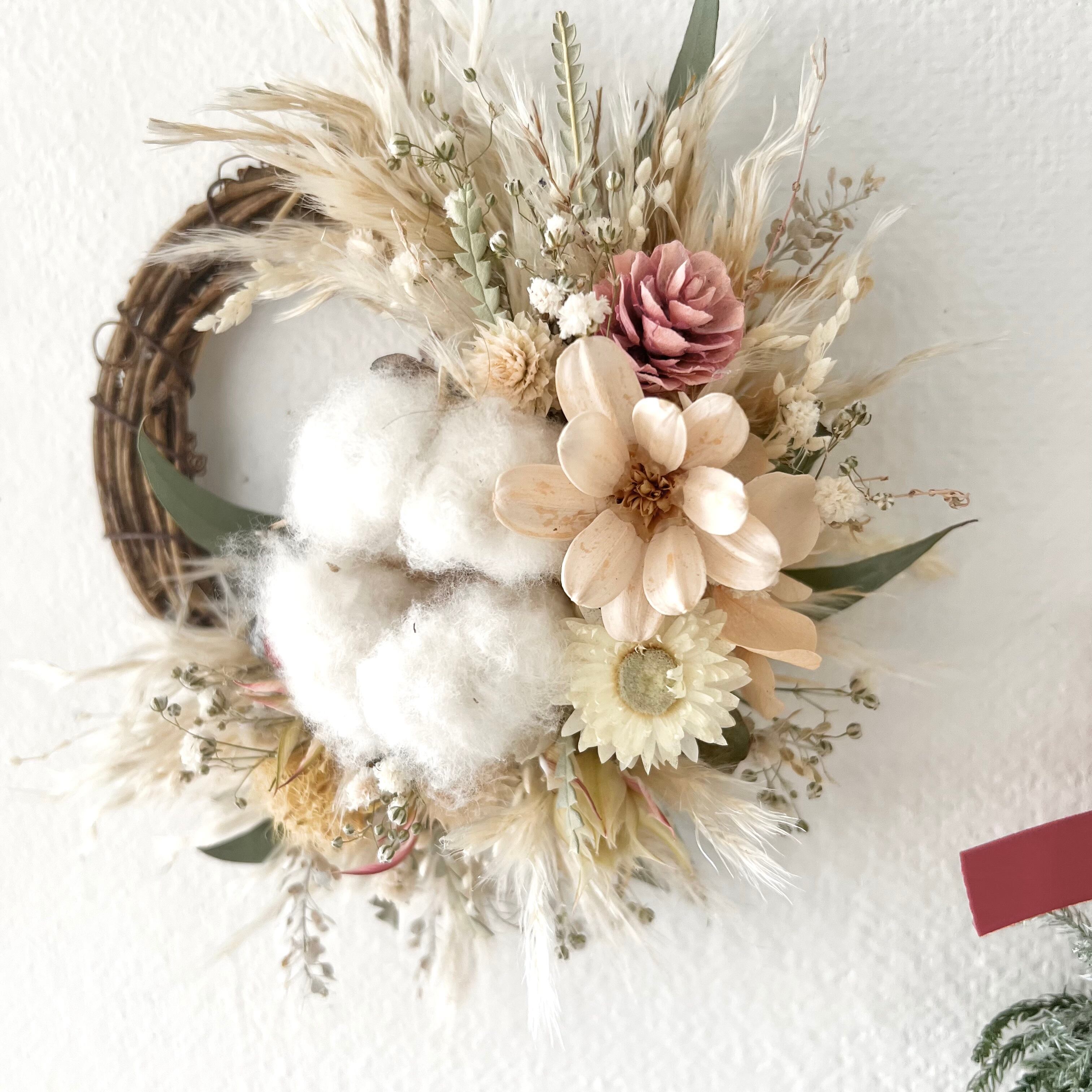 コットンフラワーとプチフラワー 小花とパンパスグラスのミニリース