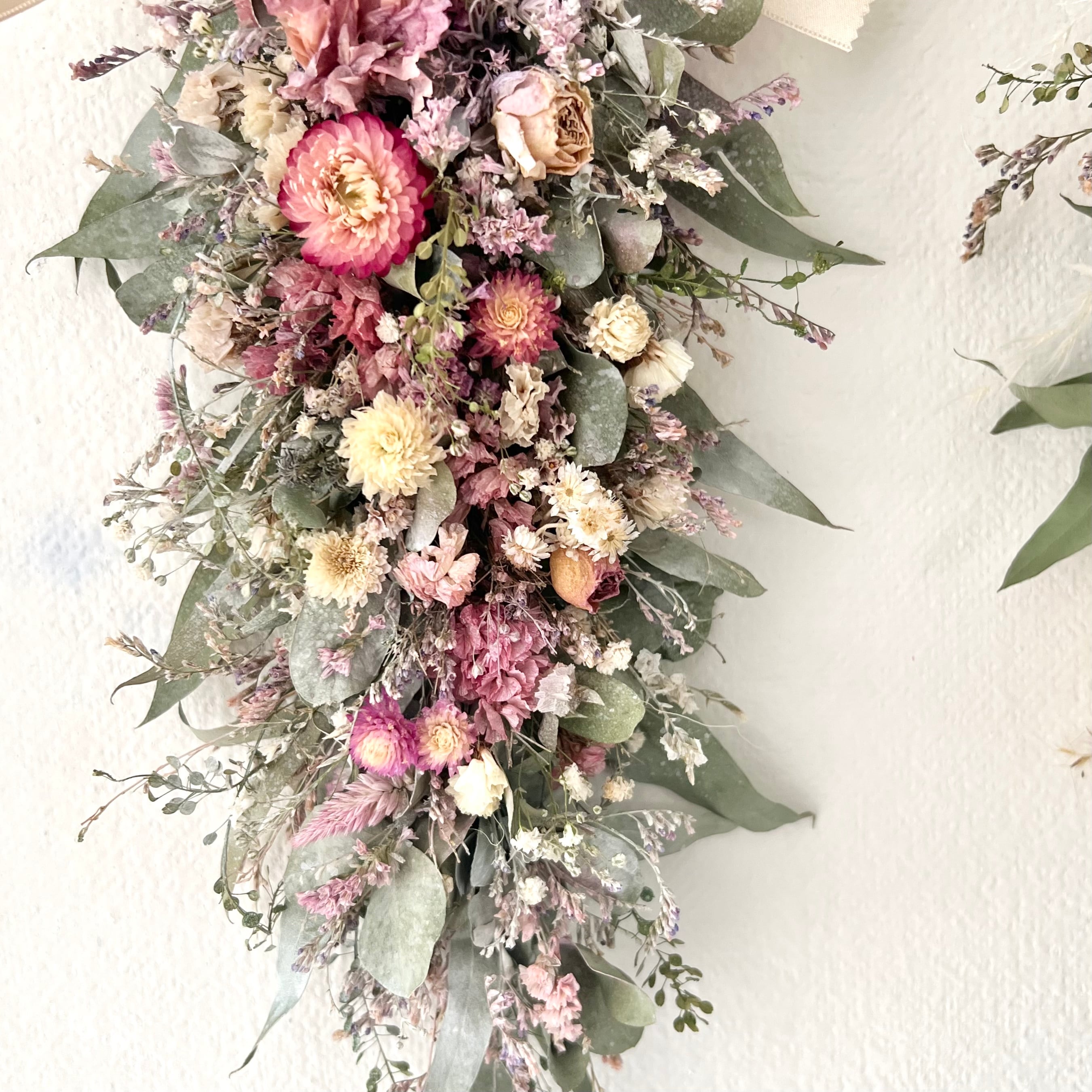 ユーカリと小花の縦型スワッグ ピンク ドライフラワー 誕生日プレゼント 引っ越し祝い 記念日. ギフト