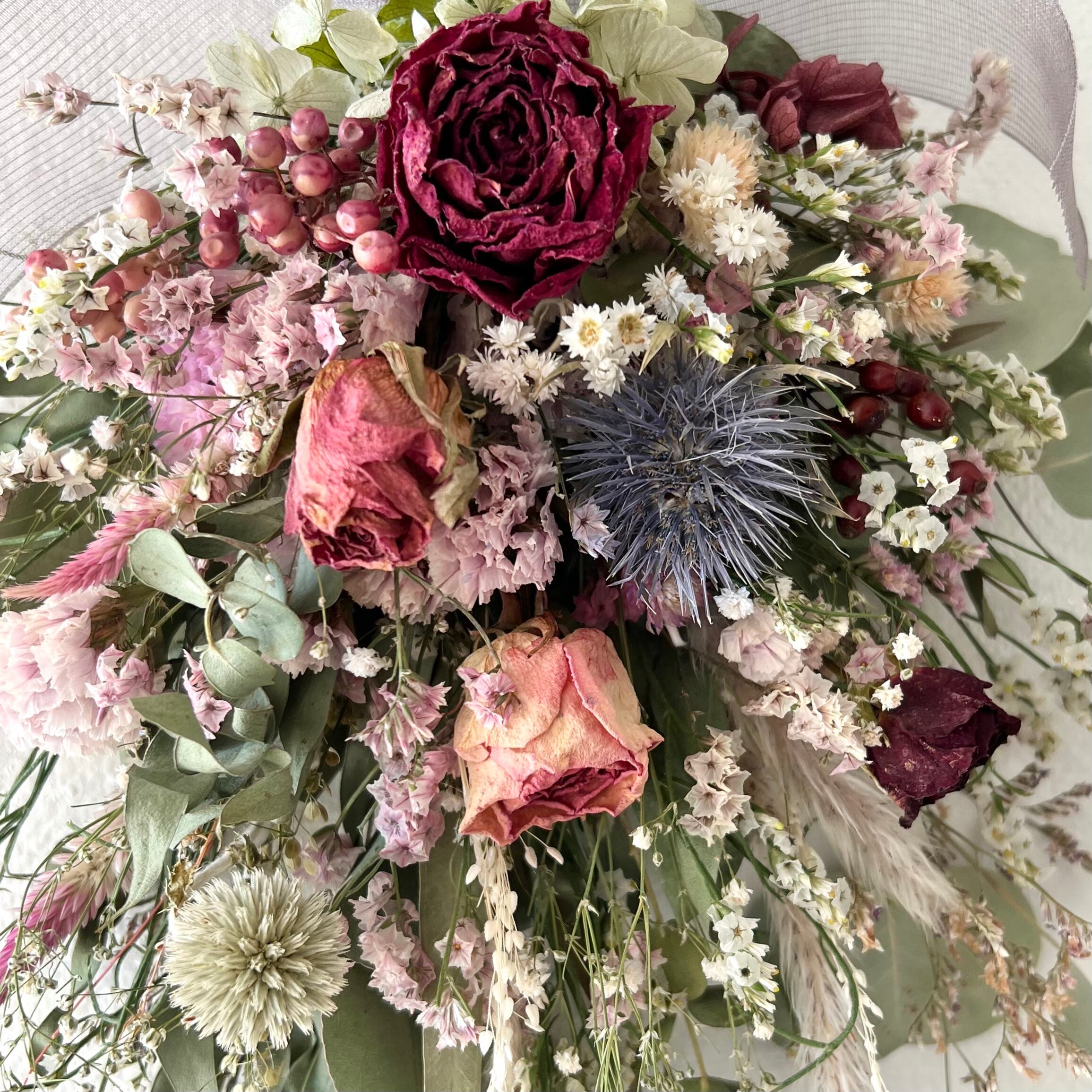 ・花材 ローズ ユーカリ スターチス かすみ草 ブルーファンタジア 千日紅 チガヤ 紫陽花 エリンジューム 瑠璃玉アザミ ペッパーベリー ハハコソウ リングラス バラの実 ケイトウ リボン等