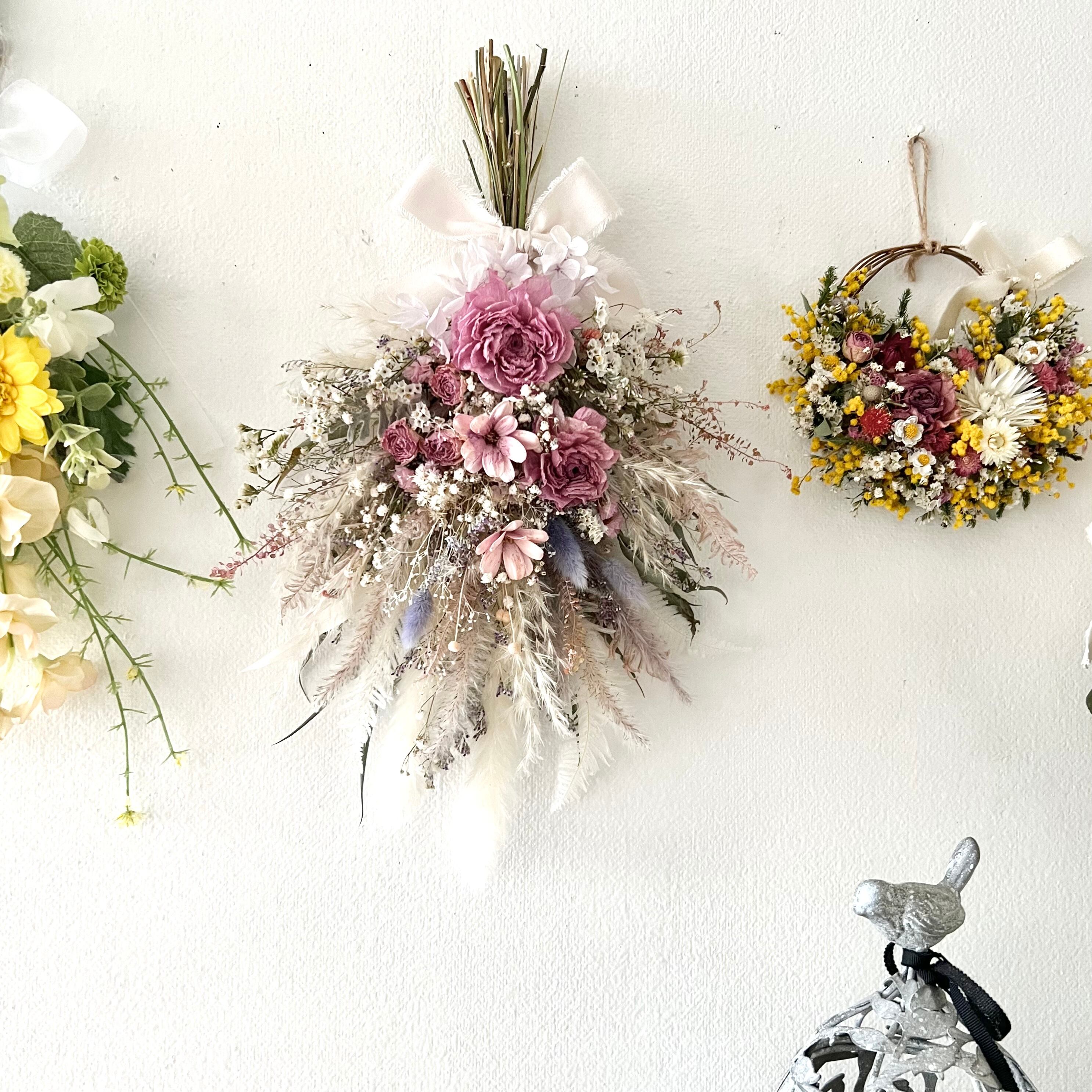 ラナンキュラスとローズ 小花の春スワッグ ドライフラワー 誕生日プレゼント 引っ越し祝い 記念日. ギフト
