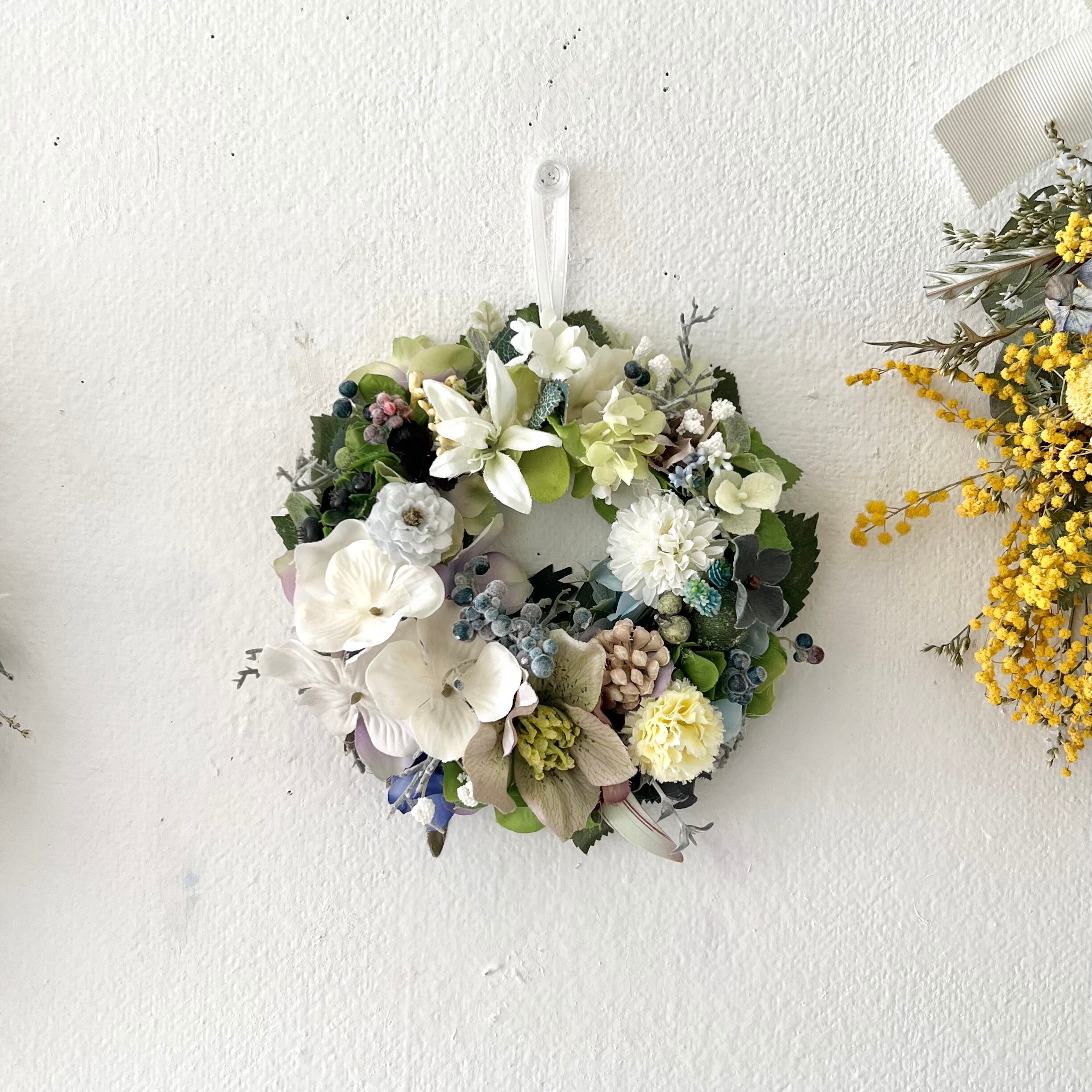 グリーンとホワイトにイエロー ブルーのお花達でお落ち着いた雰囲気のリースになっています。