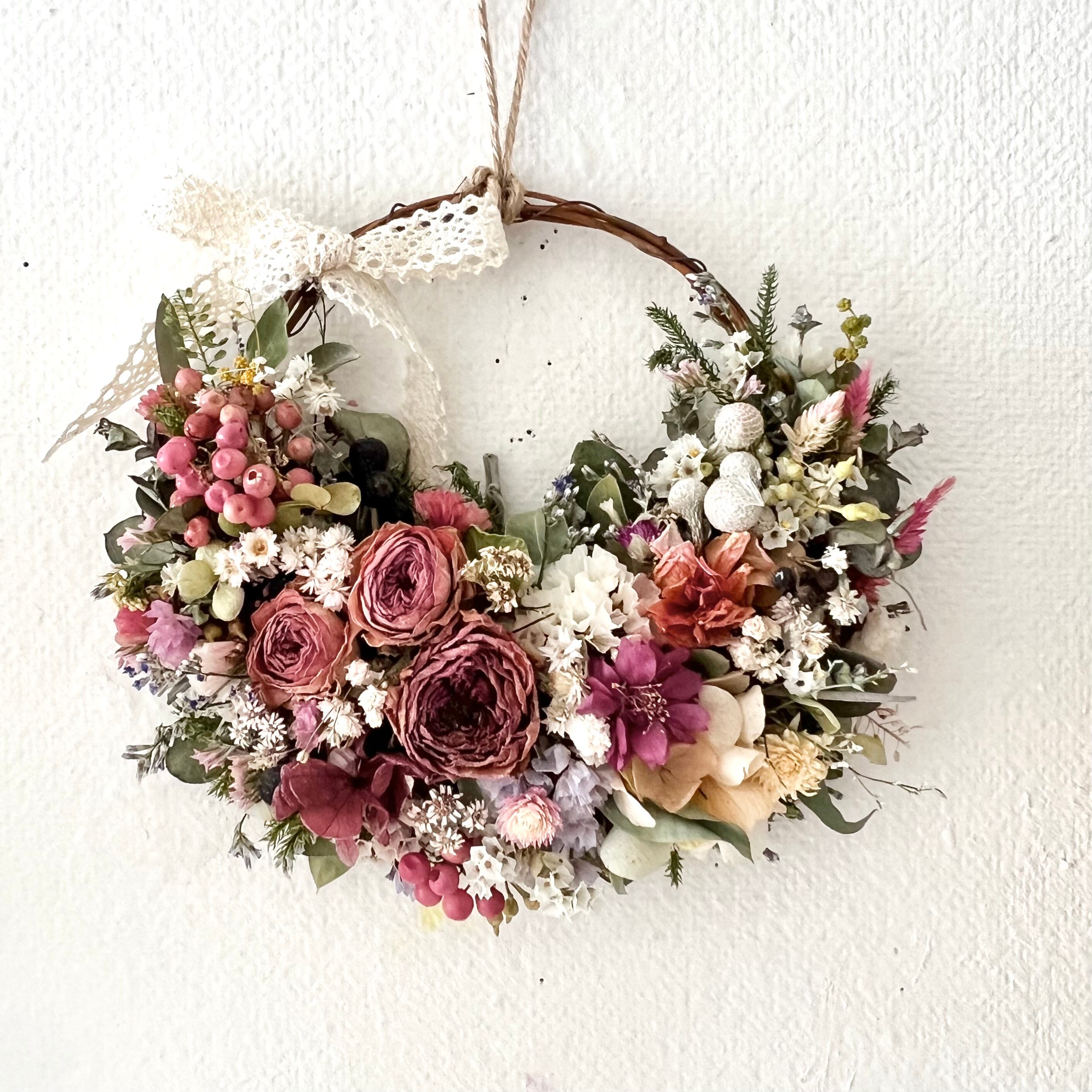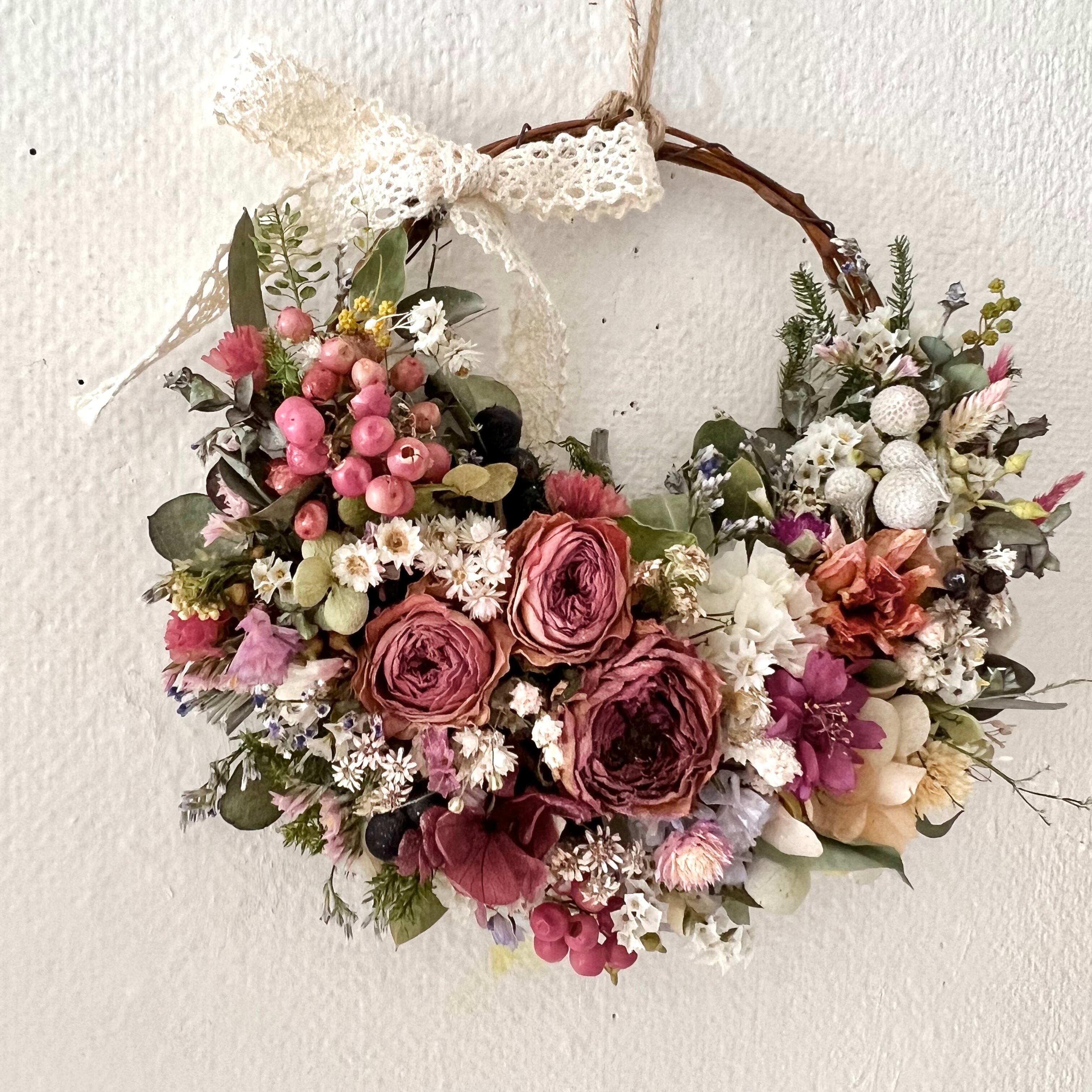 ローズと小花の春リース ドライフラワー 誕生日プレゼント 引っ越し祝い 記念日 ギフト