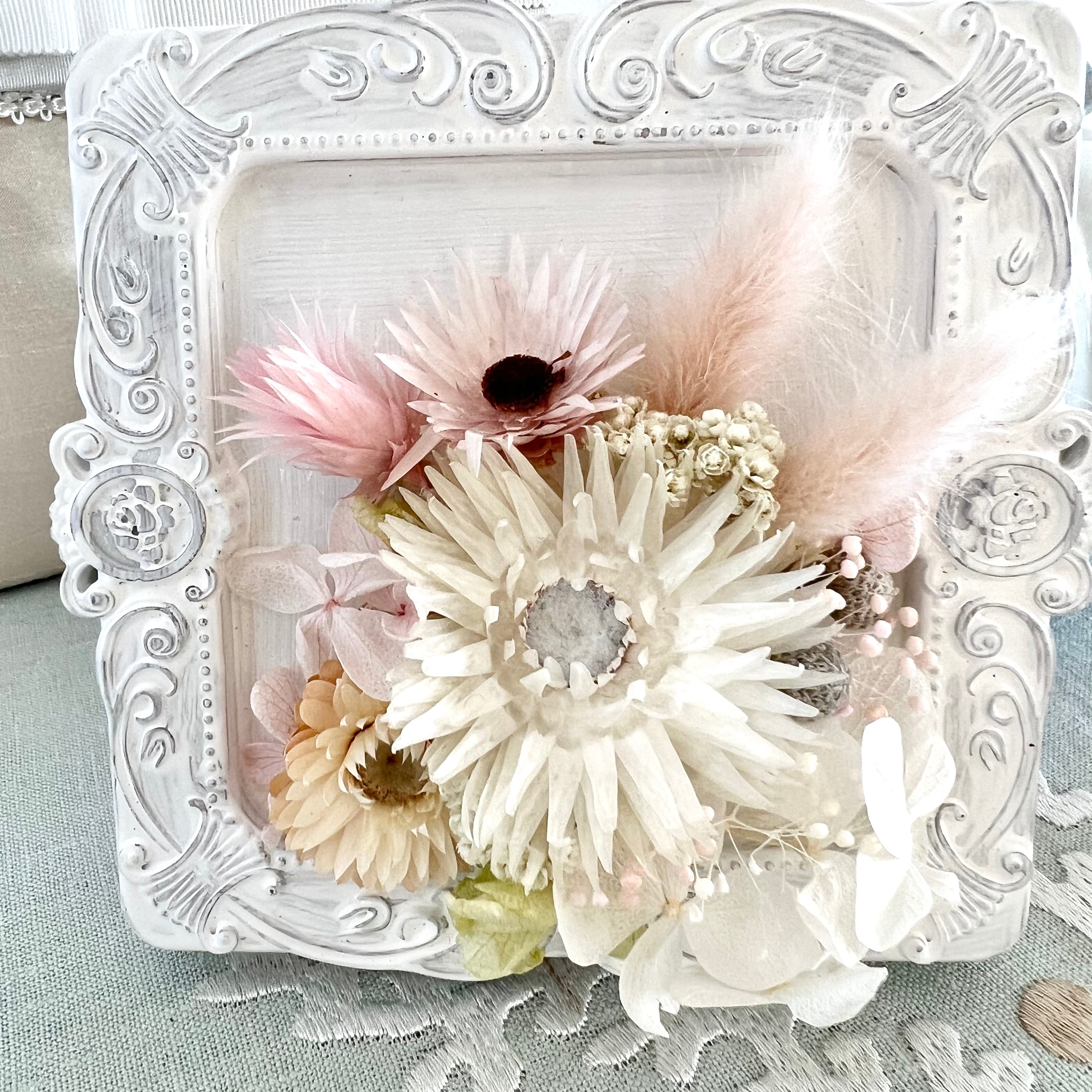 ホワイト アンティーク調フレームにホワイトとピンクのシルバーデージーと小さなお花をアレンジしました。