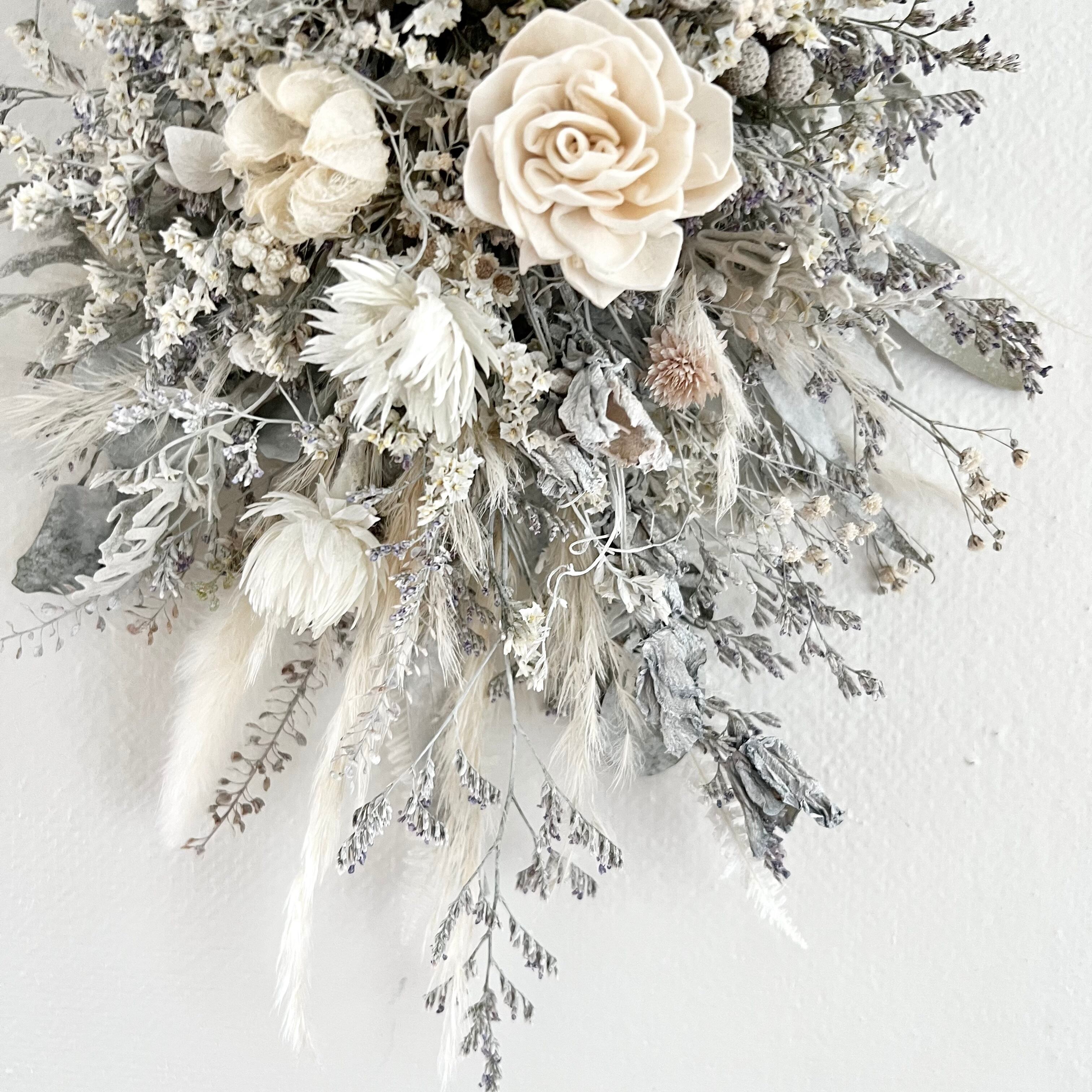 ナチュラルホワイトのソラダリアとシルバーデージー小花を合わせたスワッグです。