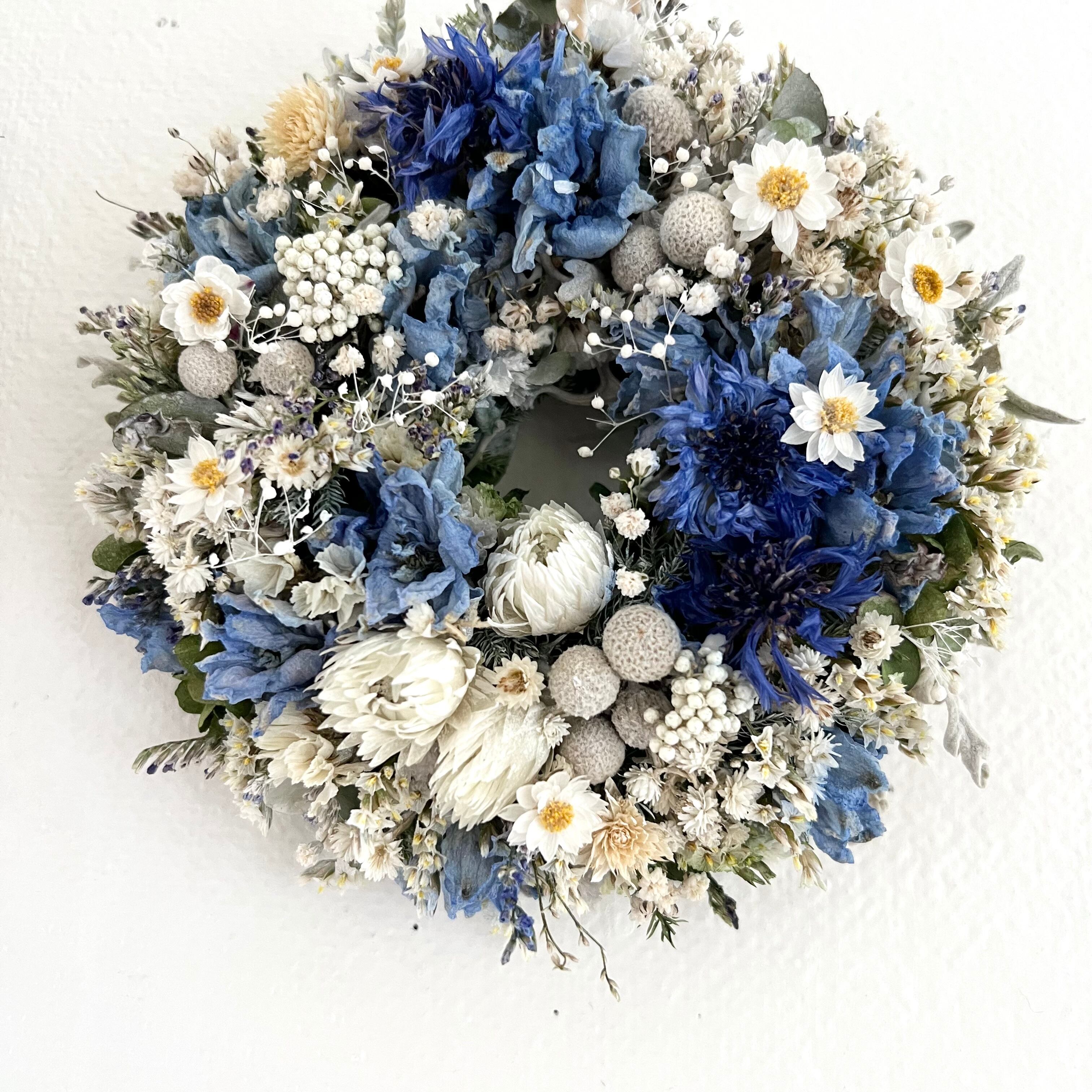 シルバーデージー 矢車草 ユーカリ 小花達のリースです。