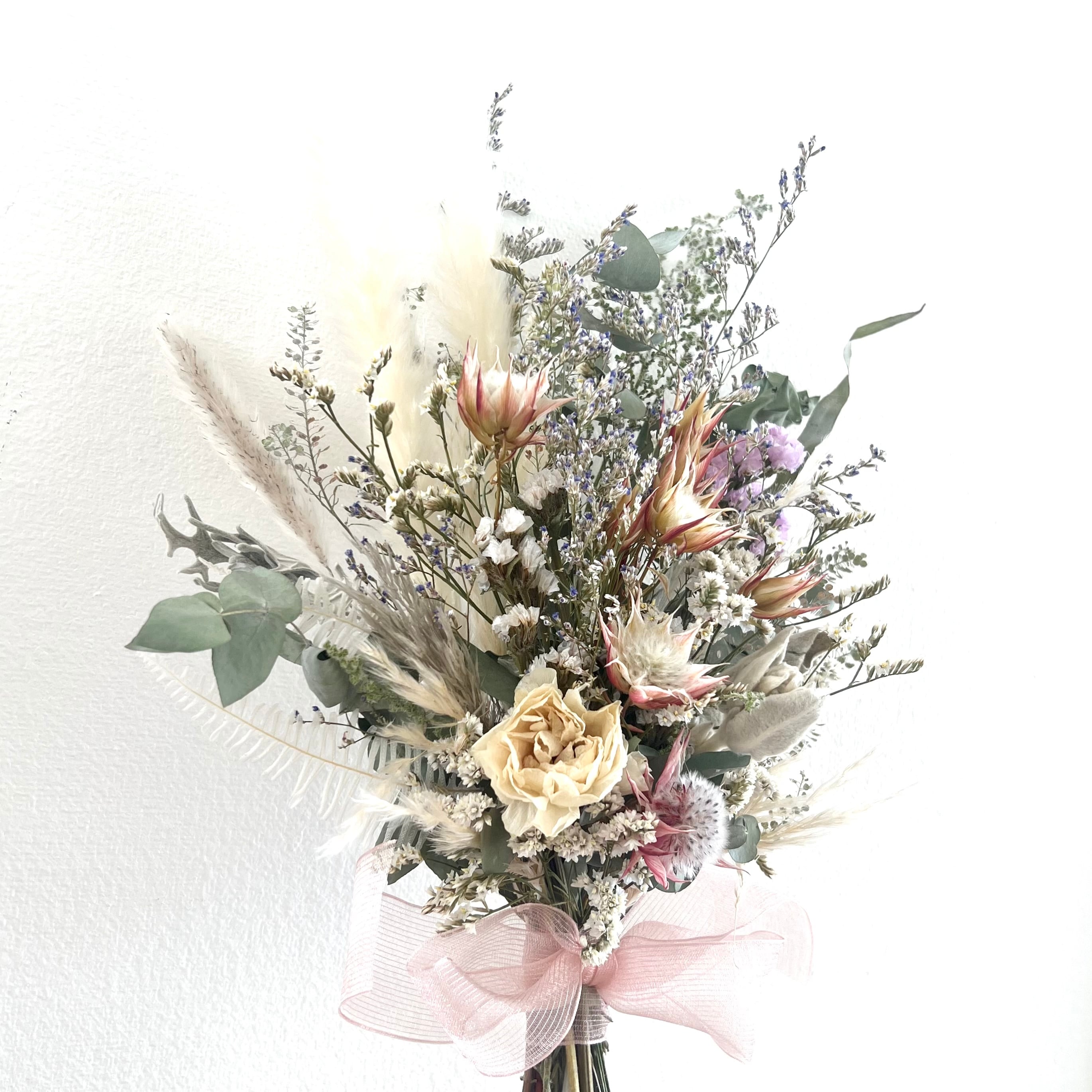 ユーカリとふわふわパンパスグラス テールリードなどスターチスなどをふんわり合わせました。
