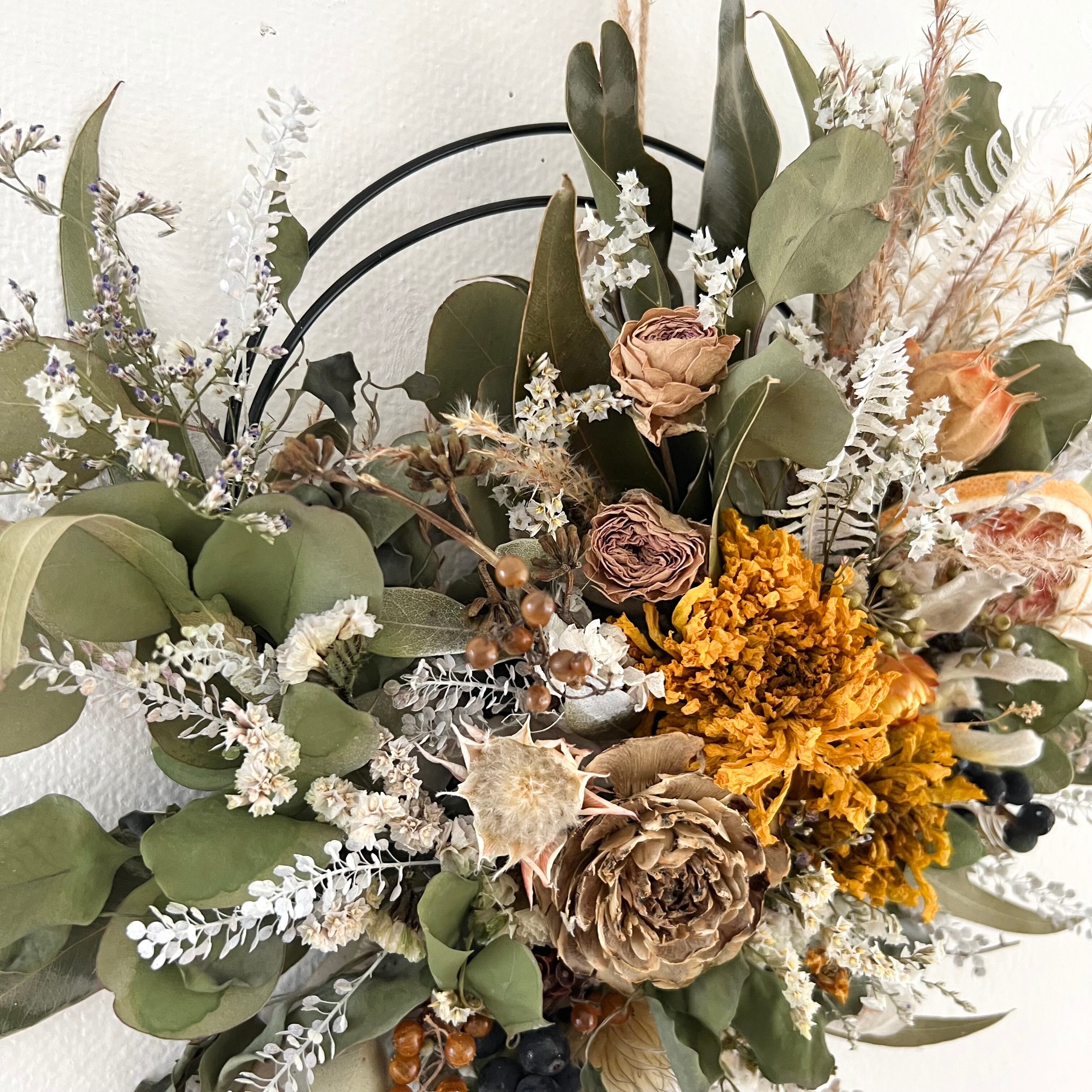 秋のリース ユーカリとマリーゴールド ハロウィン ドライフラワー 誕生日プレゼント 引っ越し祝い 記念日. ギフト