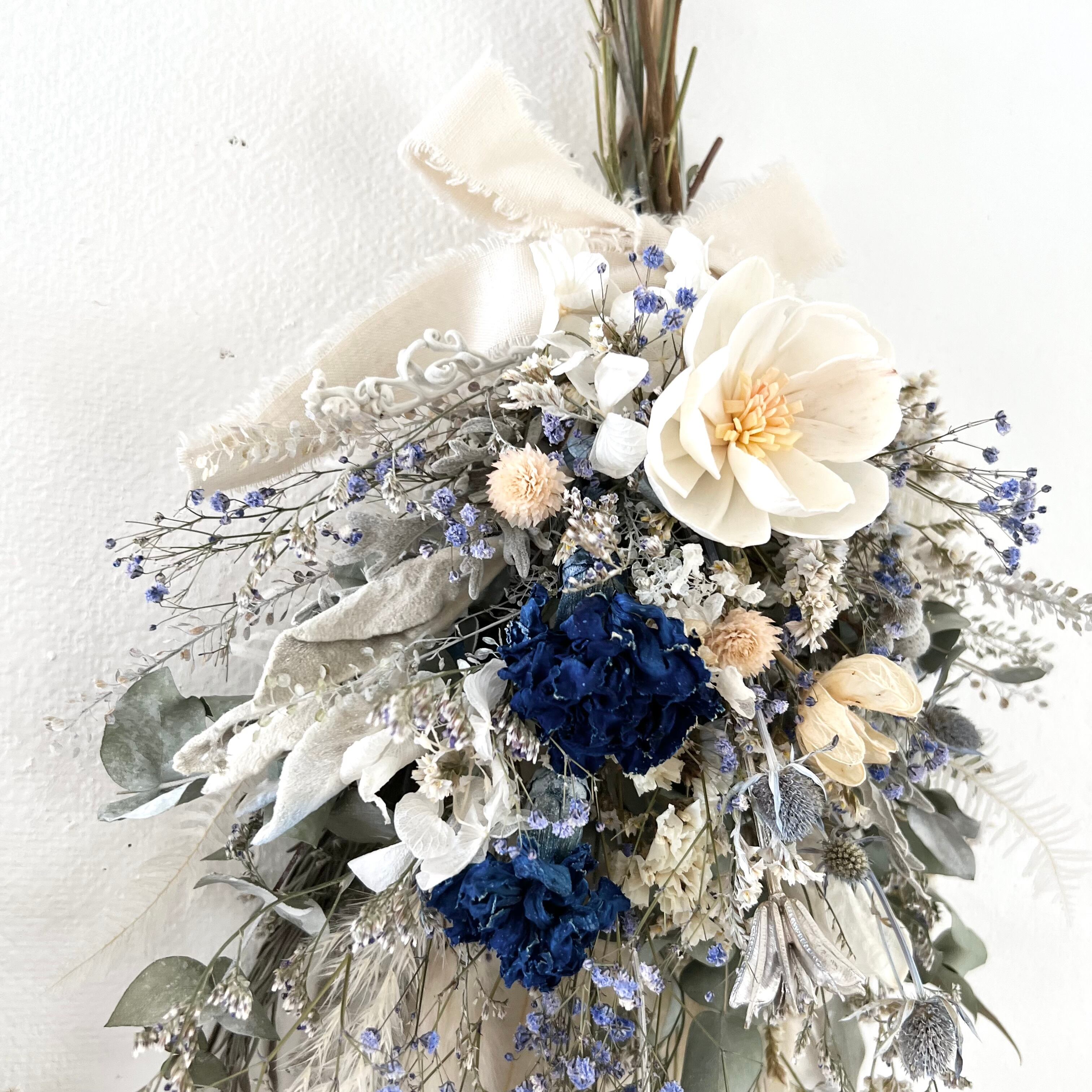 ・花材 ソラローズ カーネーション ユーカリ ナズナ スターチス かすみ草 エリンジューム ブルーファンタジア ハハコソウ シダ 千日紅 紫陽花 フヨウガラ ブルニア パンパスグラス ライスフラワー ダスティミラー テールリード ラベンダーリーフ ユリガラ リボン等