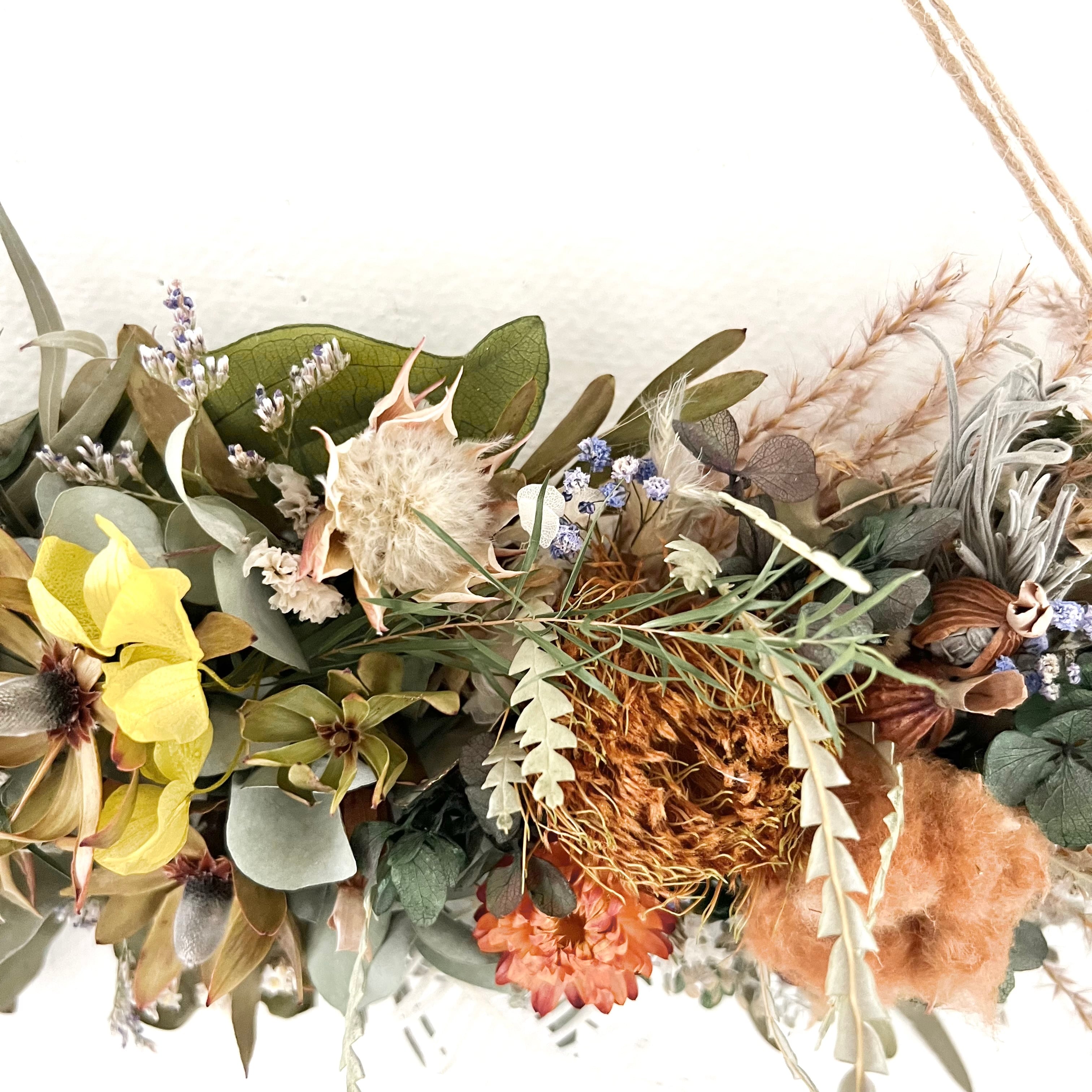ネイティブフラワーと木の実 小花の横型スワッグです。
