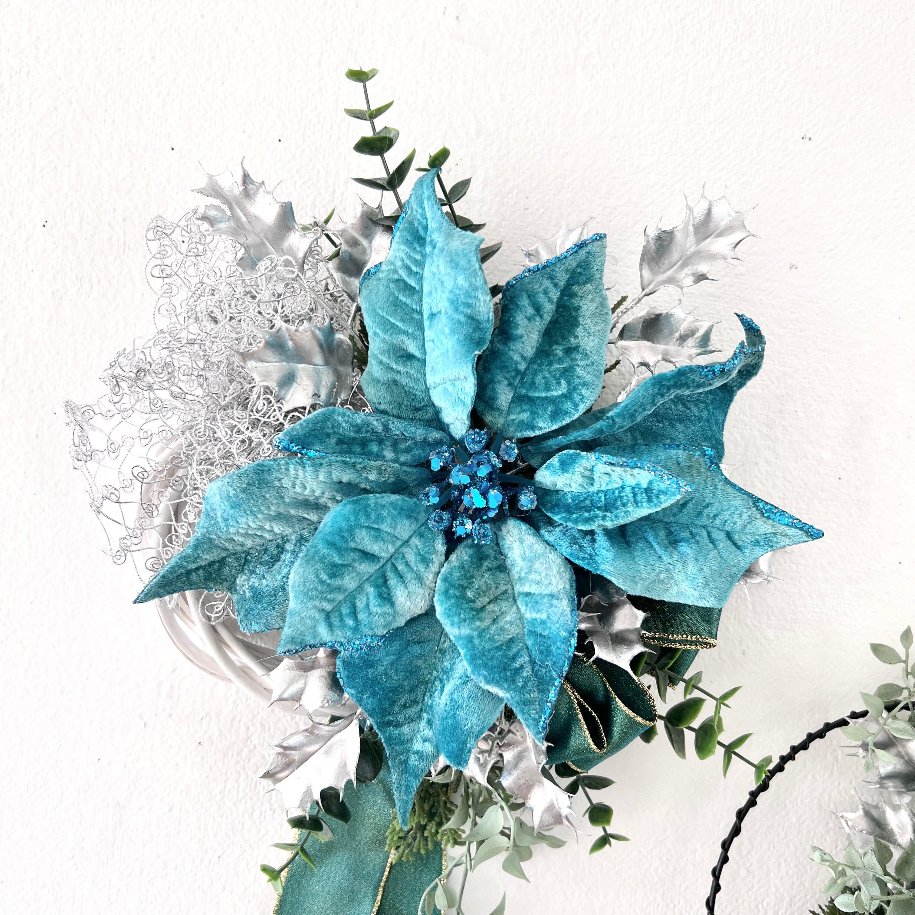 ベルベット ブルーグリーンのポインセチアにシルバーのひいらぎ リボン ユーカリなどのグリーンで