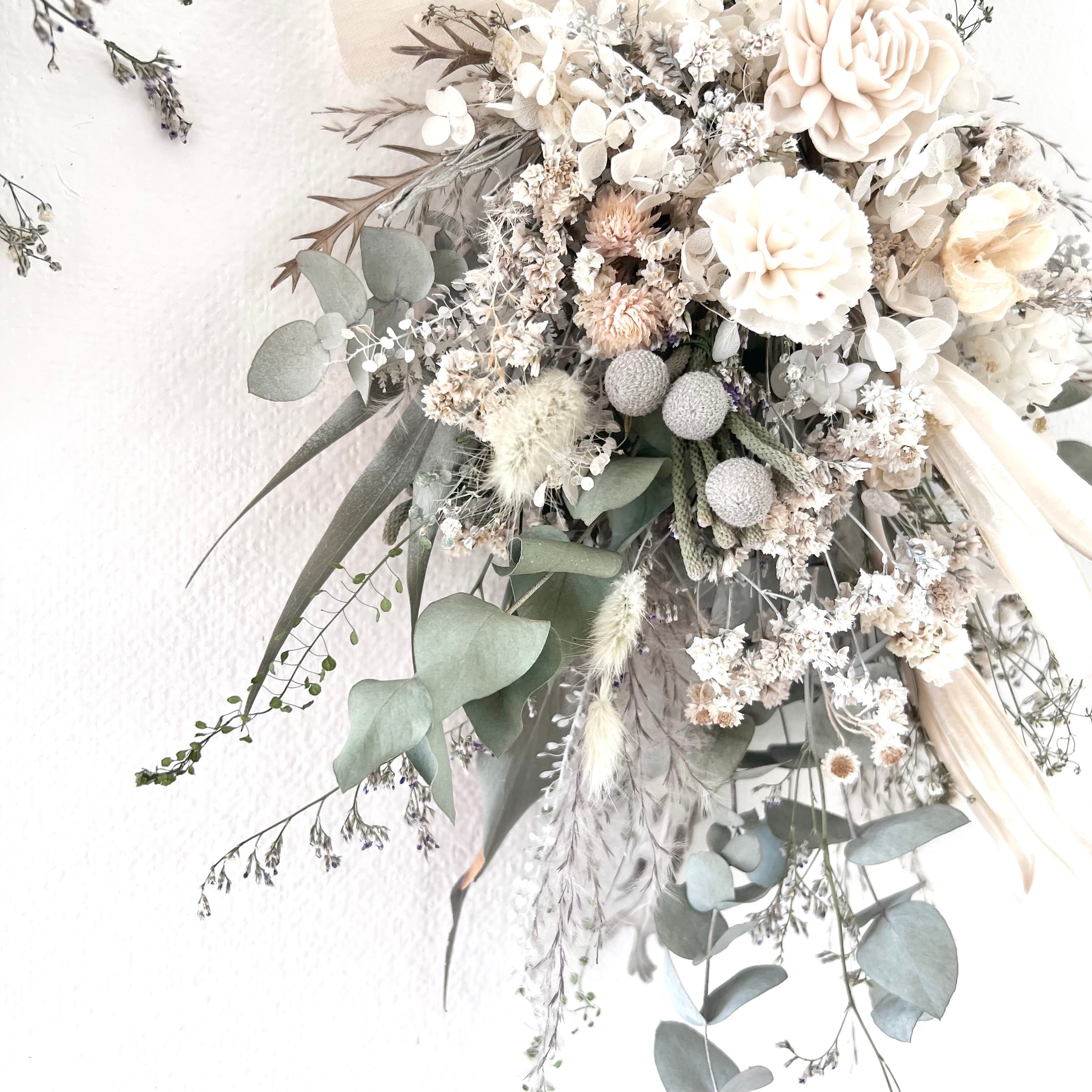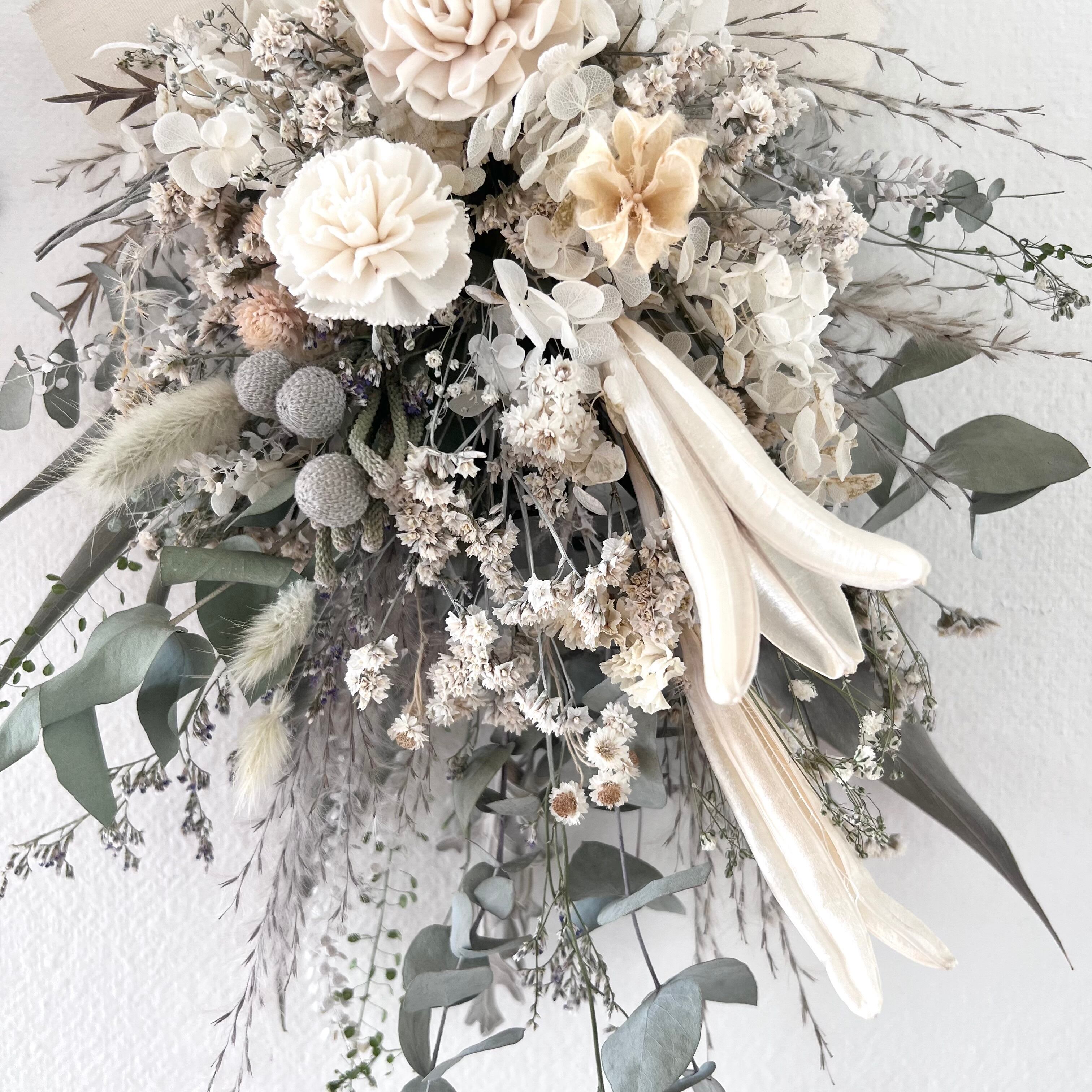 ソラダリア カーネーション ユリガラなどナチュラルホワイトのお花に スターチス ユーカリ 紫陽花グレーのパンパスグラスなどをふんわり合わせて優しい雰囲気になっています。