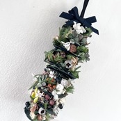 濃いめグリーンのユーカリに合わせて黒のリボンを長く垂らして落ち着いた雰囲気になっています。