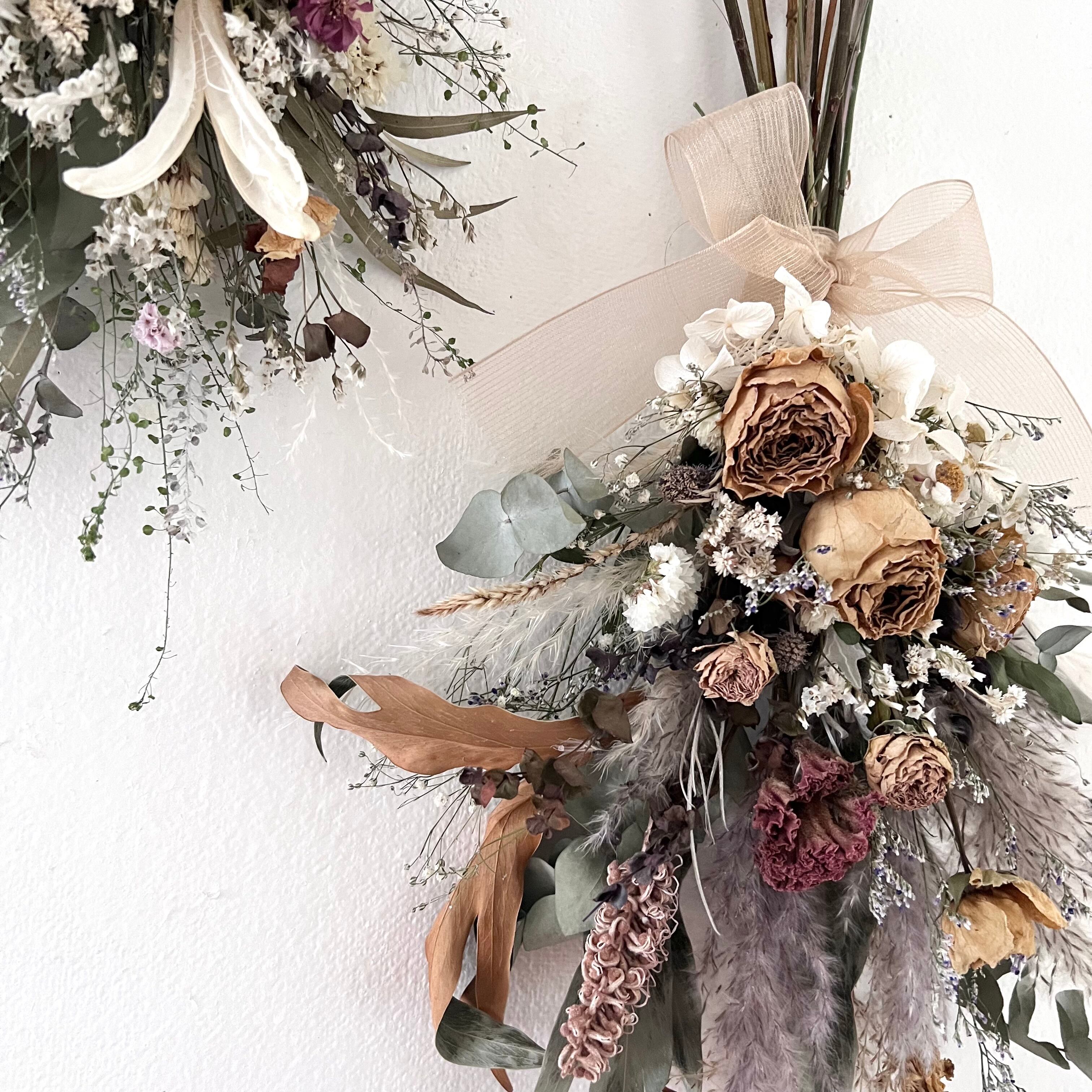 ・花材 ローズ パンパスグラス ユーカリ ナズナ スターチス かすみ草 ブルーファンタジア シダ 紫陽花 ハハコソウ シャリンパイ ライスフラワー スパイダーマン ケイトウ トルコキキョウ ユーフォリカム 花かんざし ヒペリカム グレビレアゴールド リボン等