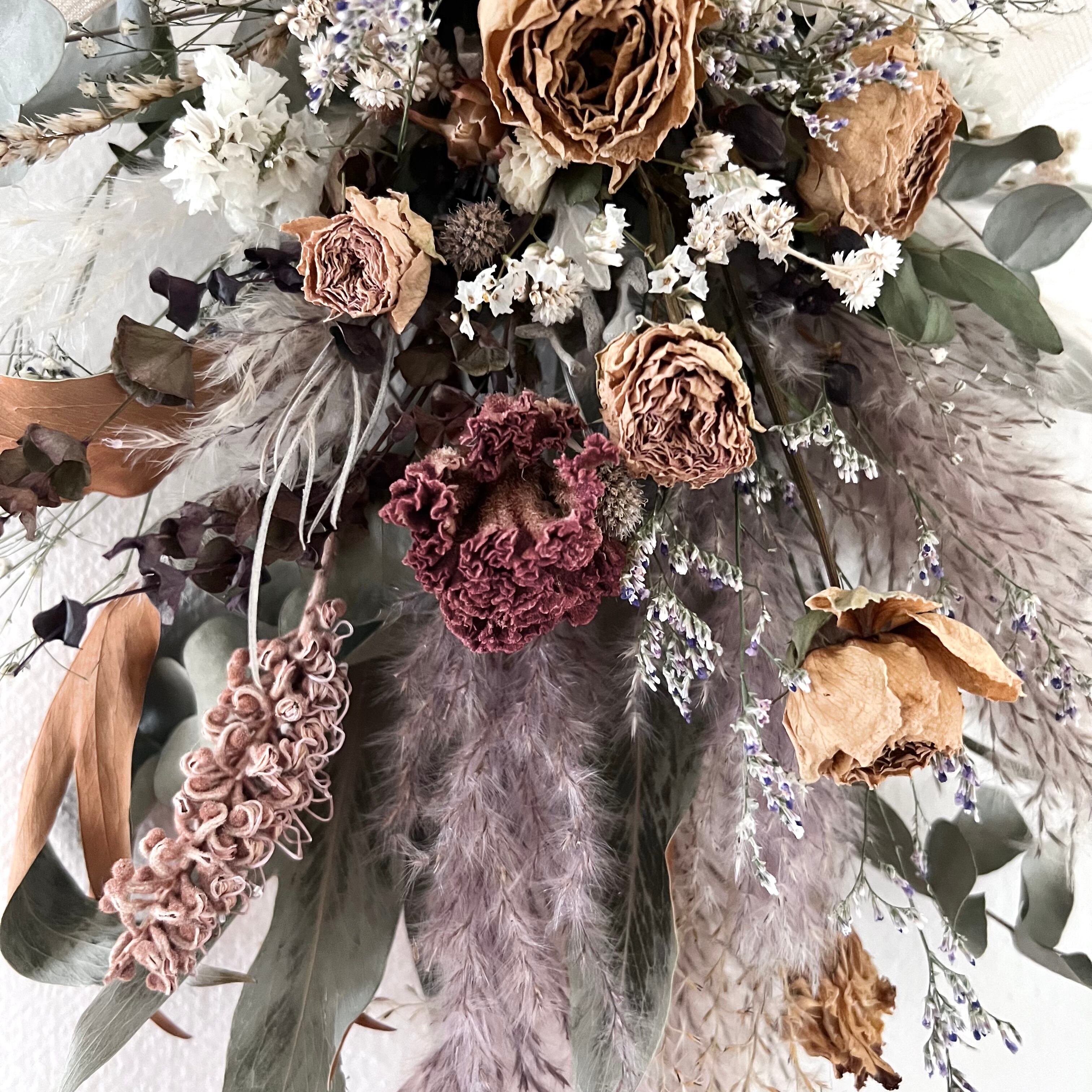 チャコールのパンパスグラス ススキとアンティークカラーのローズ スターチス ユーカリ 紫陽花などを合わせました。