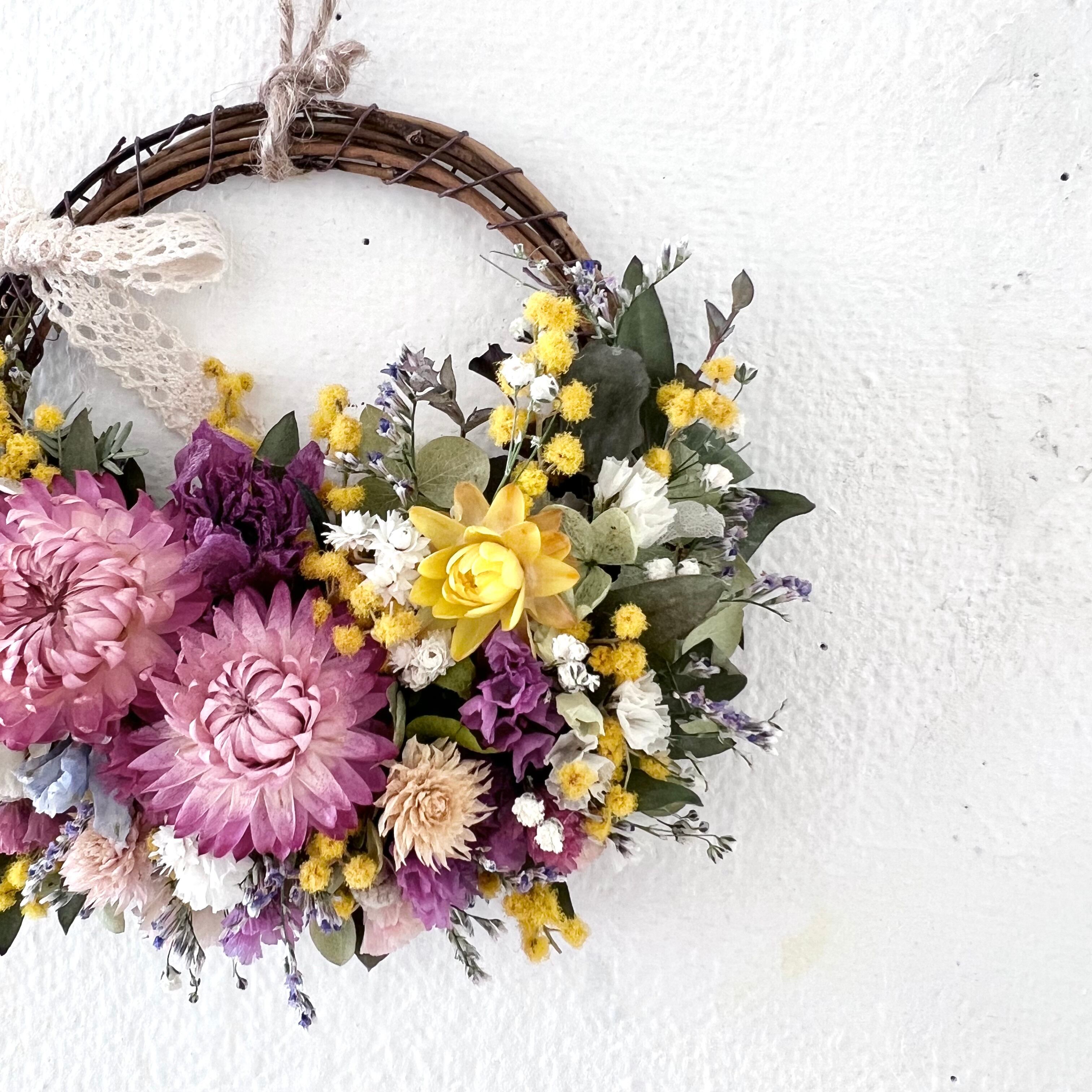 ヘリクリサムとミモザの春リース ドライフラワー 誕生日プレゼント 引っ越し祝い 記念日. ギフト