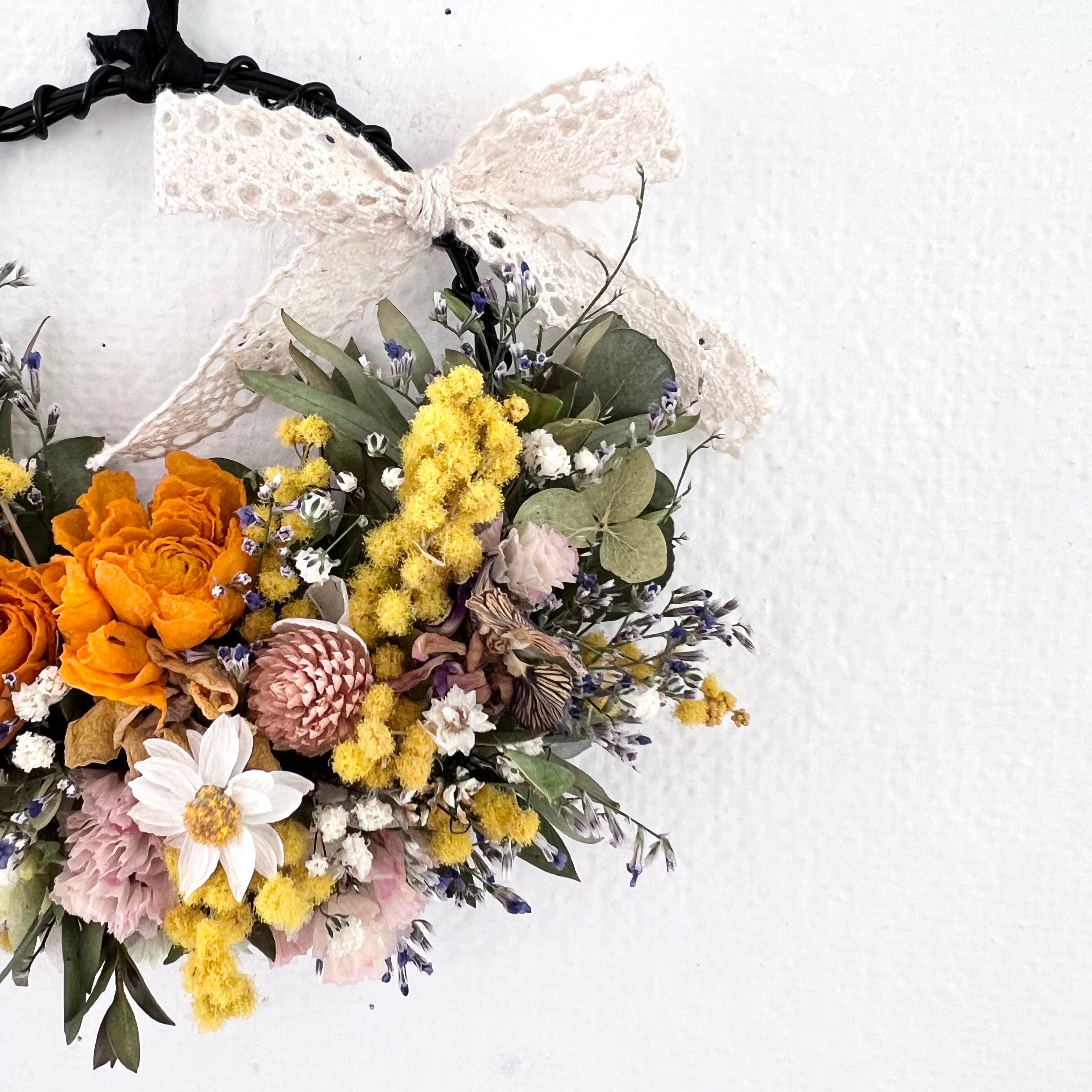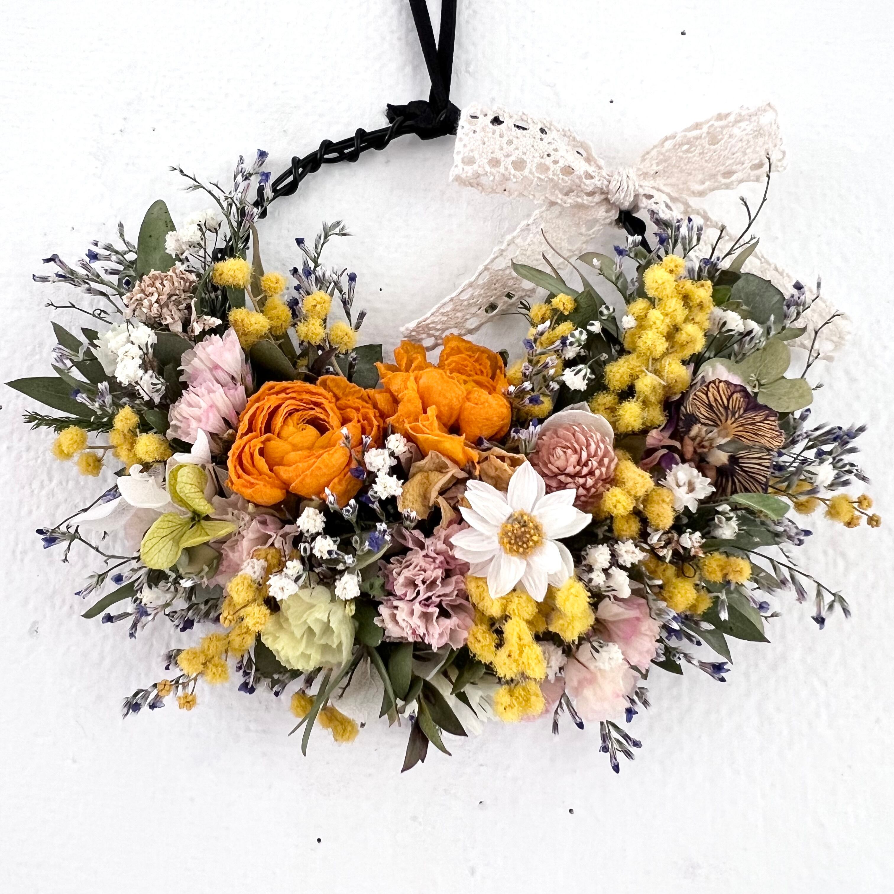 ラナンキュラスとミモザのミニリース ドライフラワー 誕生日プレゼント 引っ越し祝い 記念日. ギフト