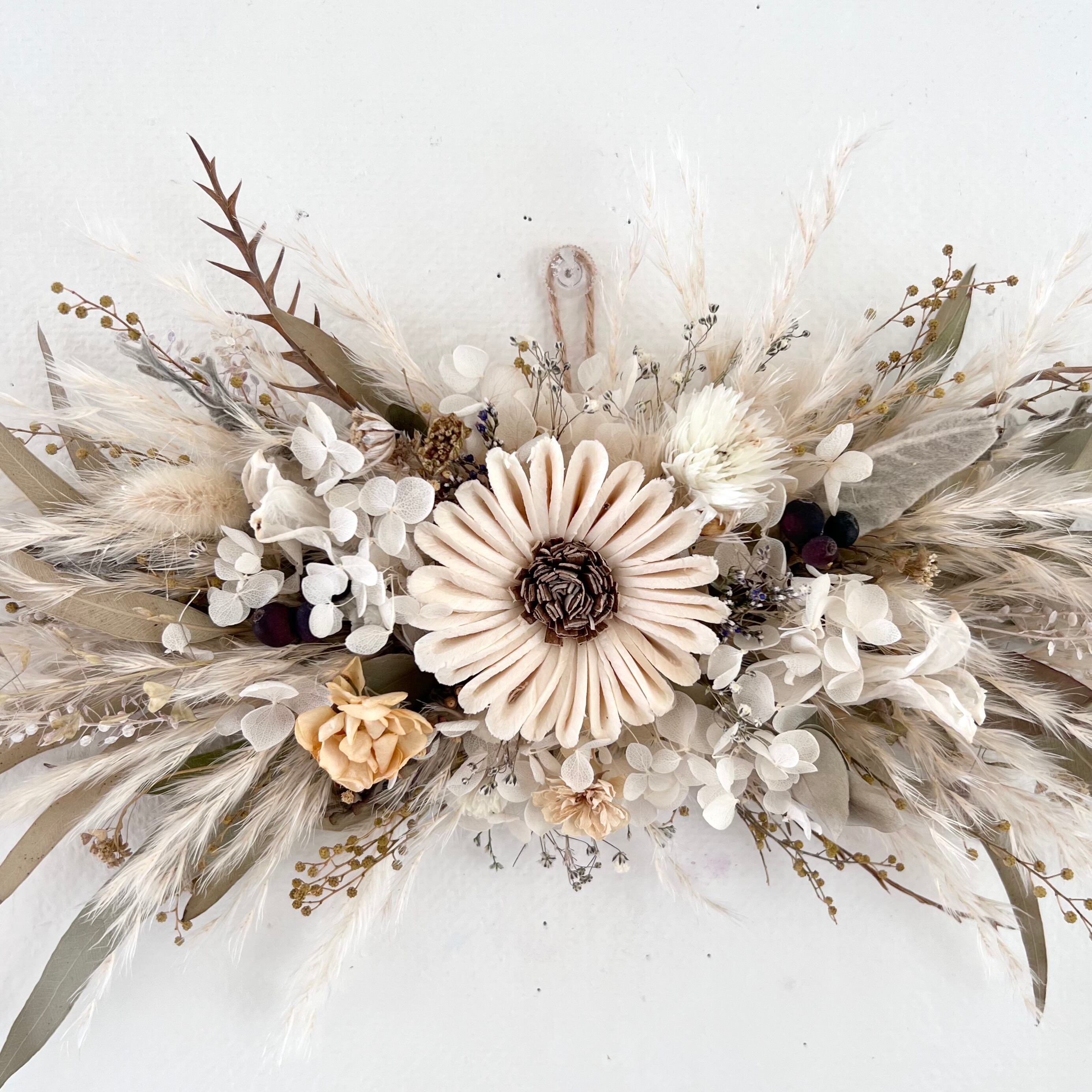 ソラひまわりと小花の横型スワッグです。