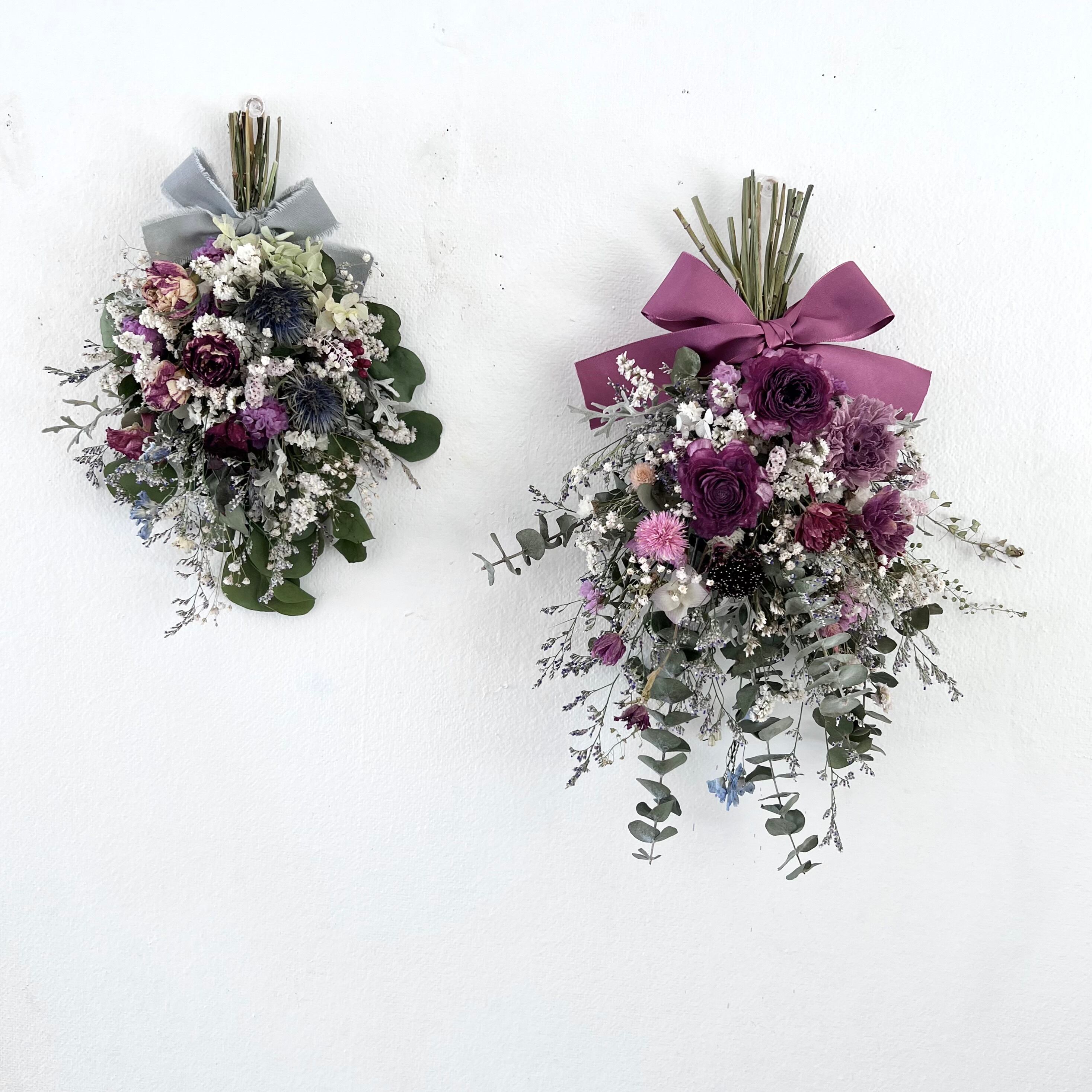 ・花材 ユーカリ ローズ ラナンキュラス エリンジューム スターチス かすみ草 ブールーファンタジア 紫陽花 ナズナ 千日紅 ペッパーベリー ダスティミラー HBスターチス リボンなど