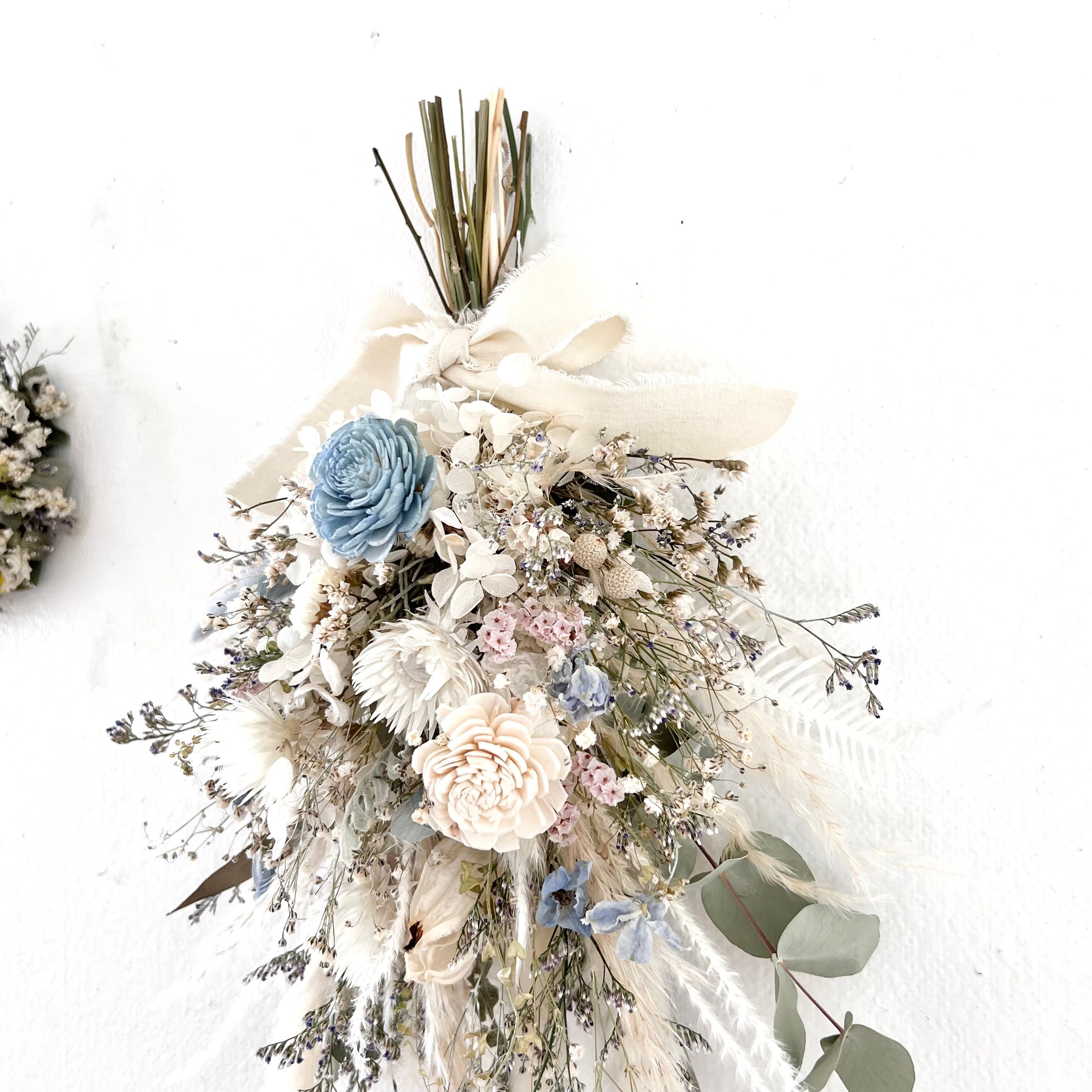 ブルーとホワイトのソラローズとシルバーデージー ふわふわパンパスグラス 小花をふんわり合わせました。