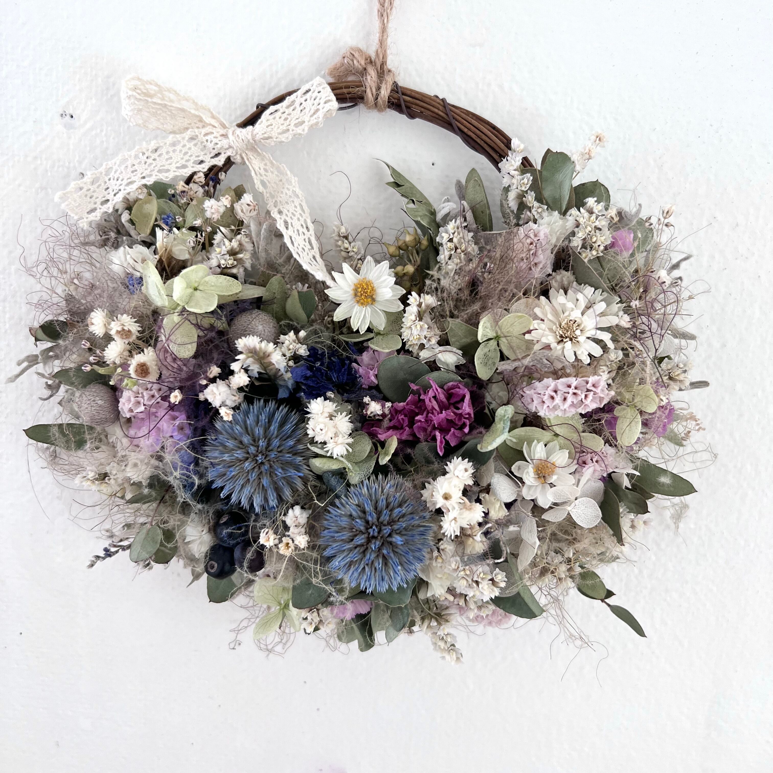 瑠璃玉アザミ スモークツリーのリース ドライフラワー 誕生日プレゼント 引っ越し祝い 記念日. ギフト 424