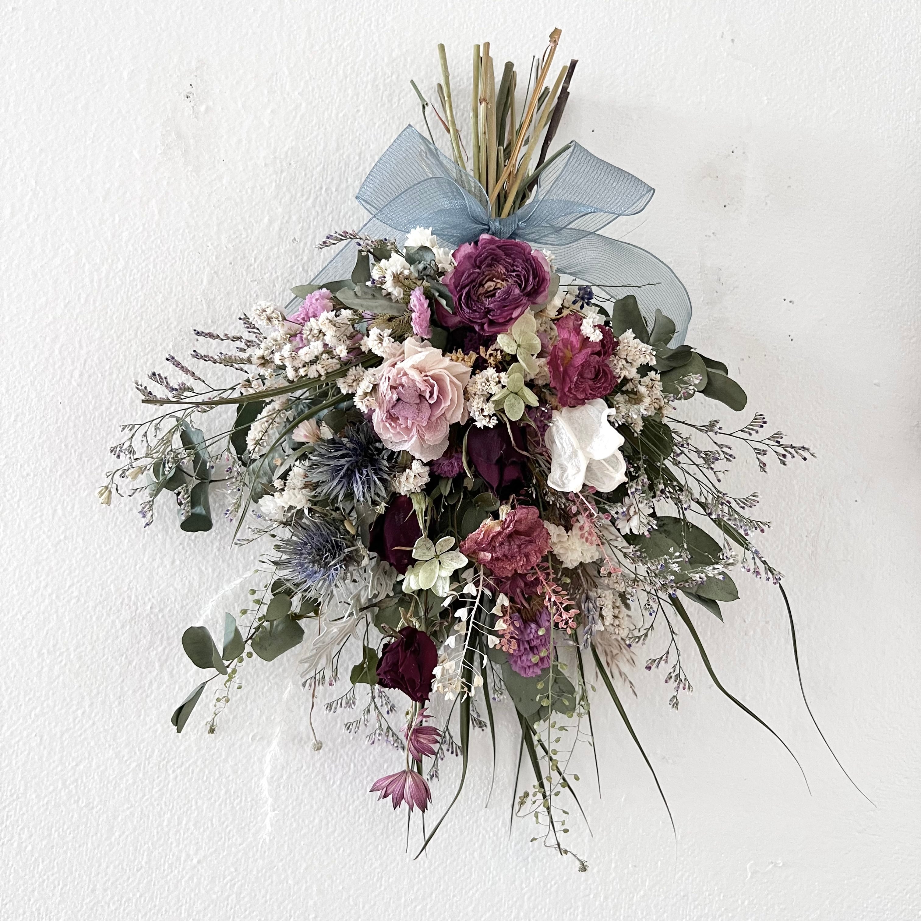 ・花材 ユーカリ ラナンキュラス ローズ エリンジューム スターチス かすみ草 ダスティミラー 千日紅 ブルーファンタジア HBスターチス 紫陽花 フランネルフラワー アストランチア ススキ ダスティミラー ナズナ ムスカリ リボン等