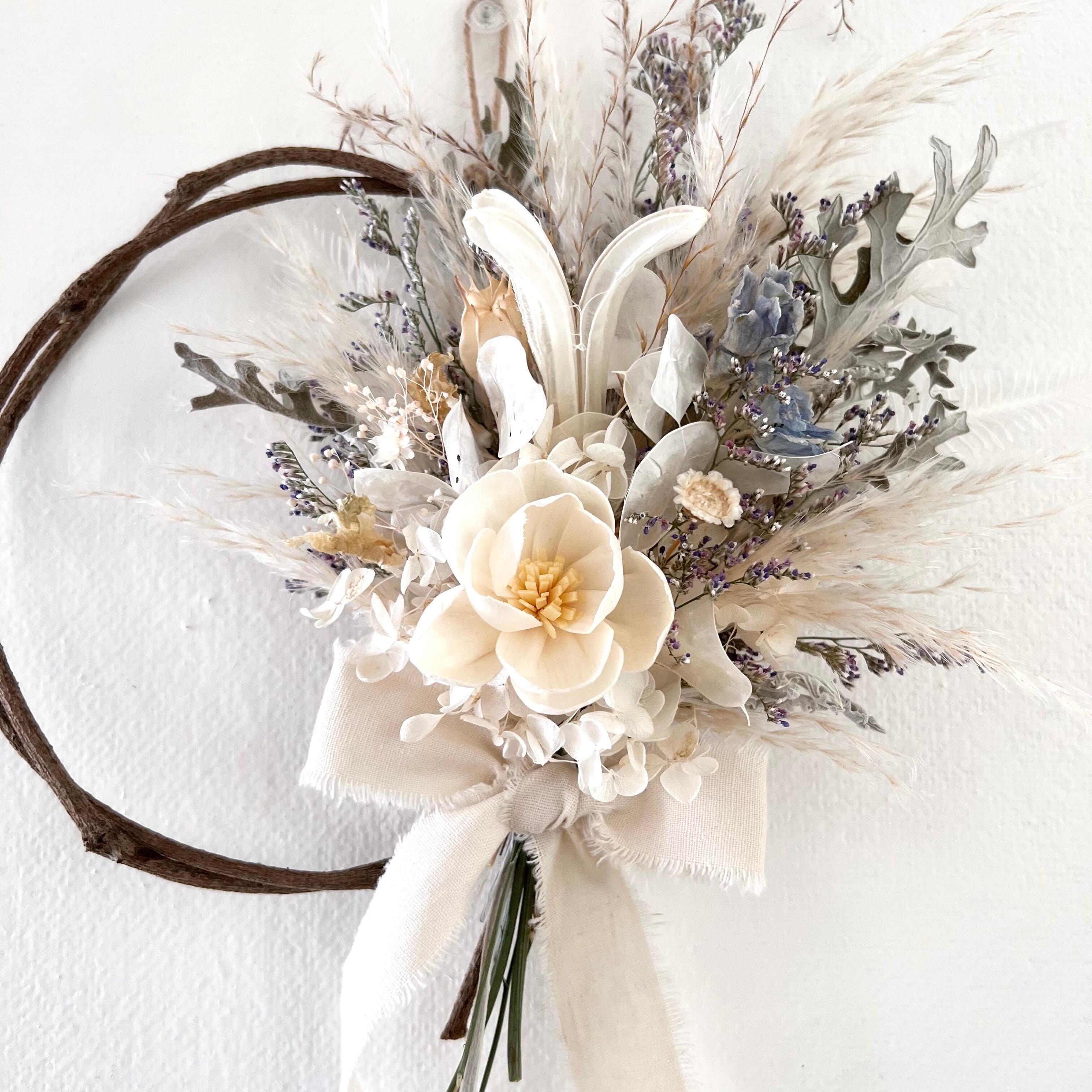 ナチュラルホワイトのソラチェリッシュにパンパスグラス 紫陽花 スターチス かすみ草などカラーのお花を合わせたスワッグを蔓のリースに飾りました。