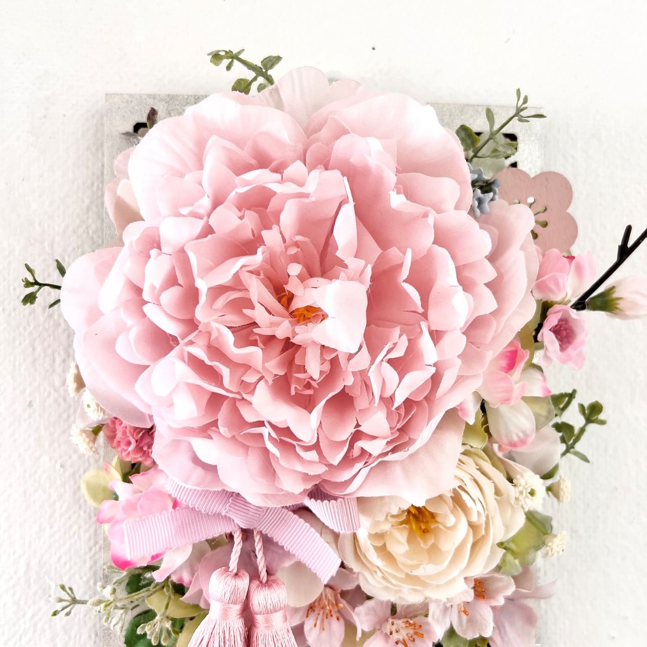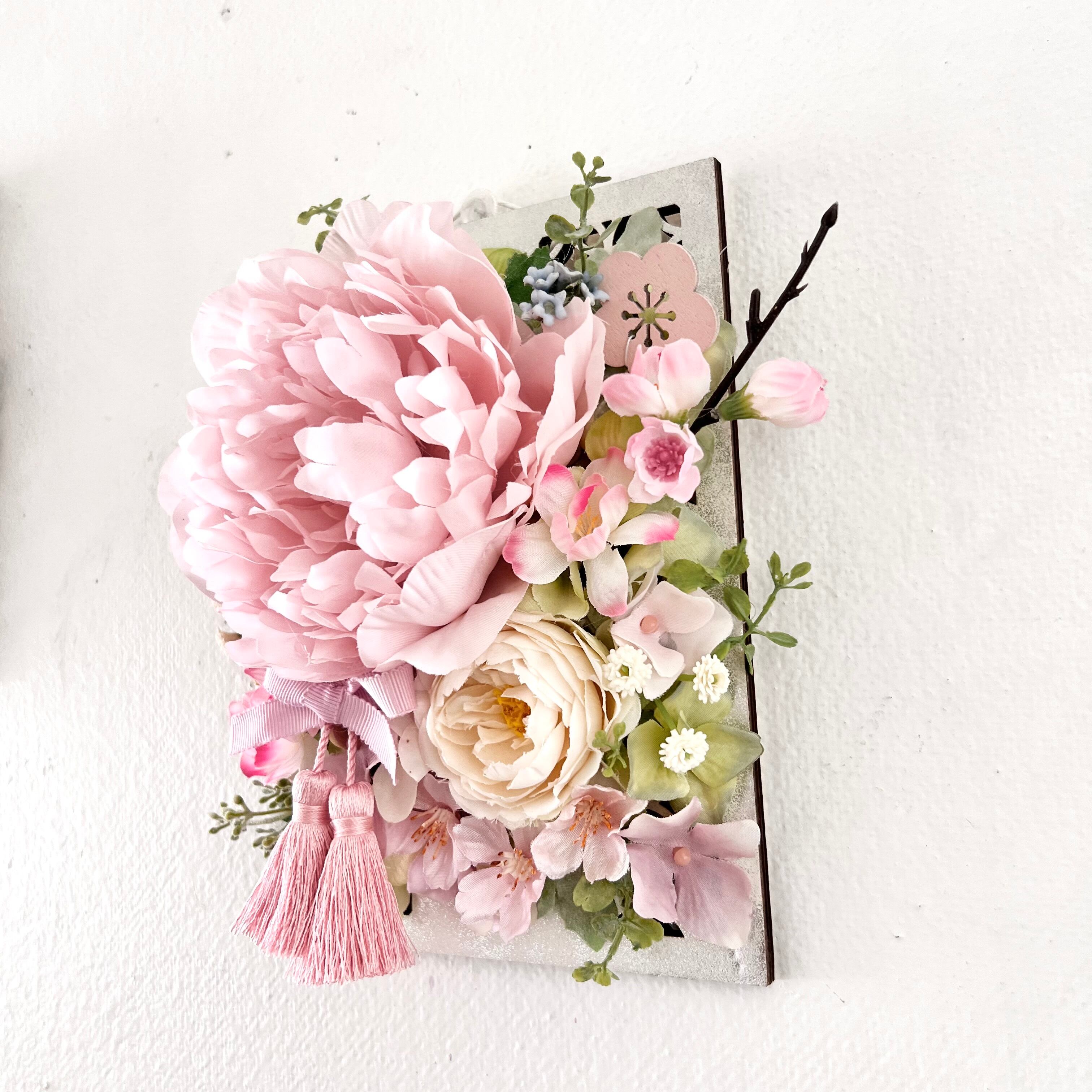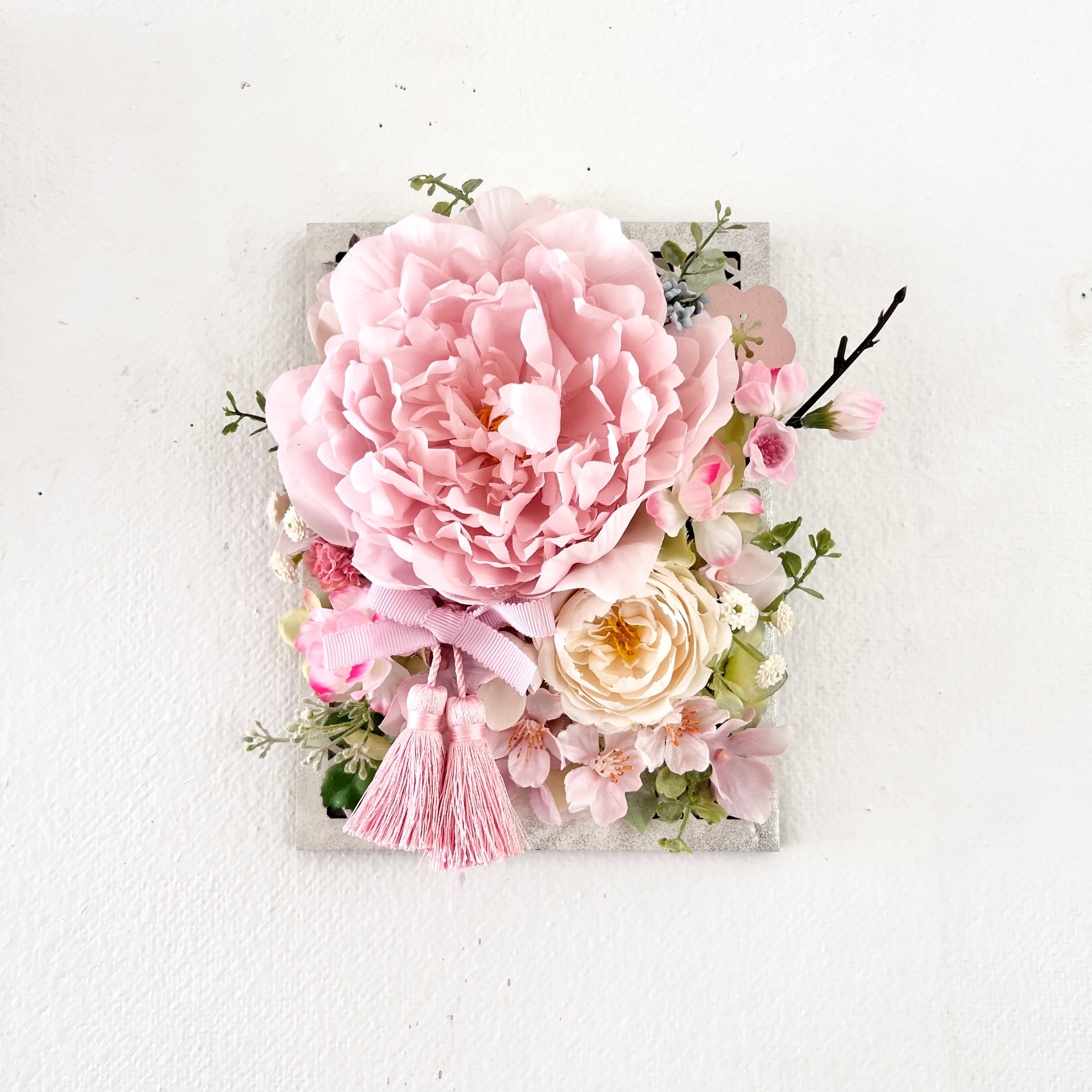 ピオニー 桃の花 ラナンキュラス 紫陽花 かすみ草 マム アキレア グリーンリーフ タッセル リボン 和風木製フレーム
