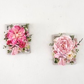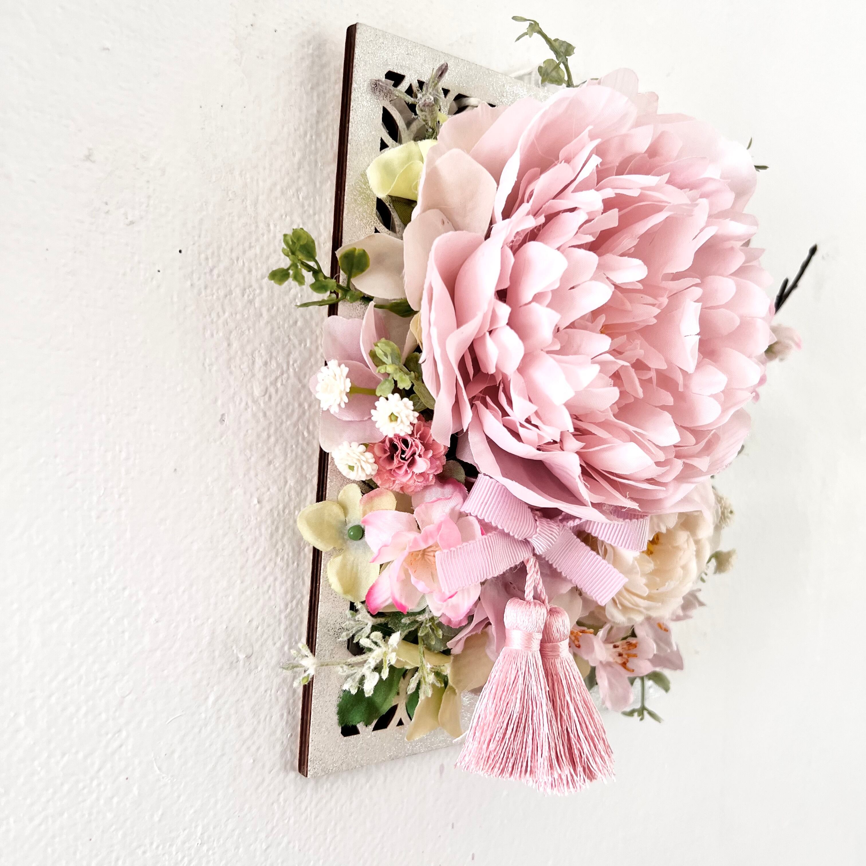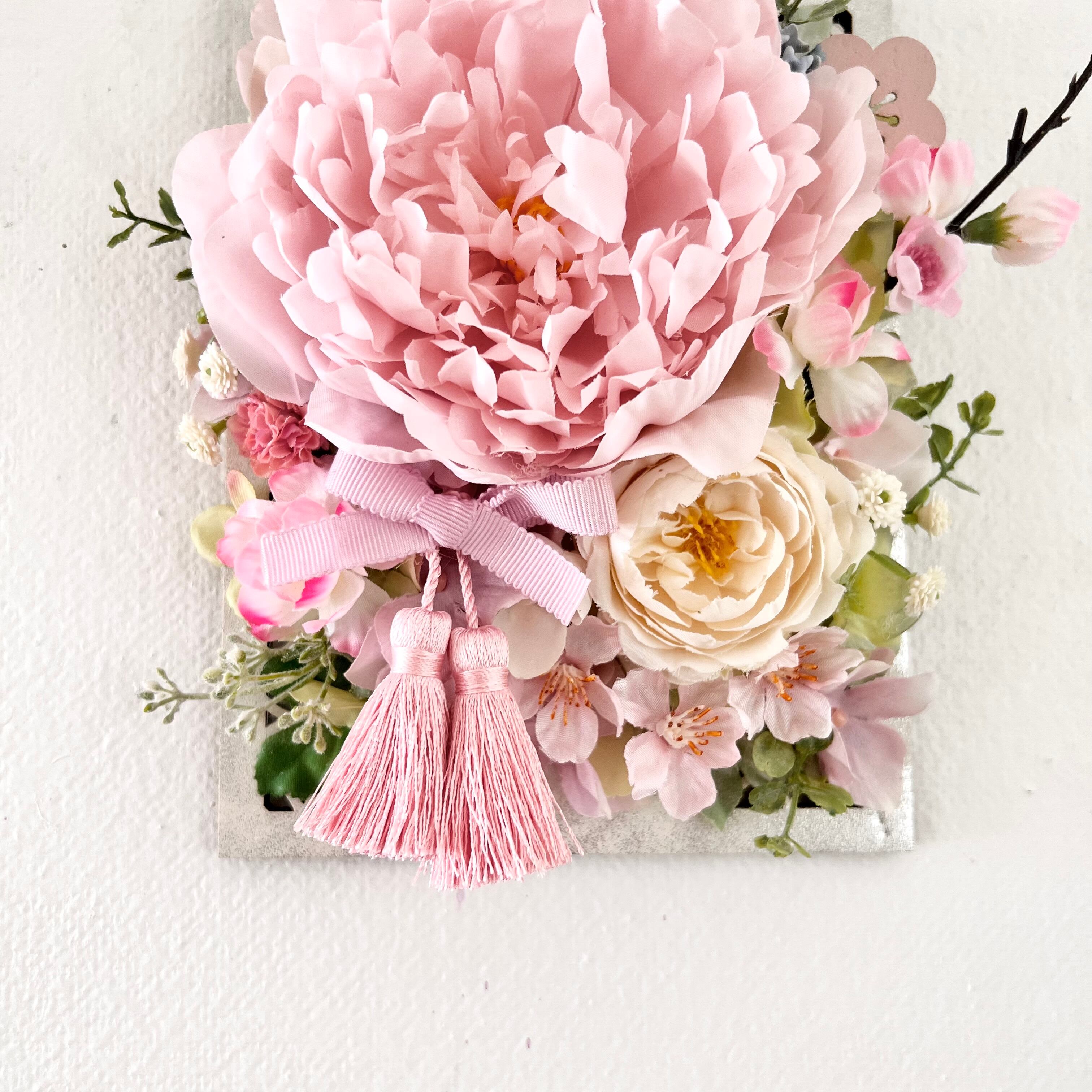 和風木製フレームに、春のお花 ピオニー ラナンキュラス 桃のお花と桜 小さなお花を合わせました。